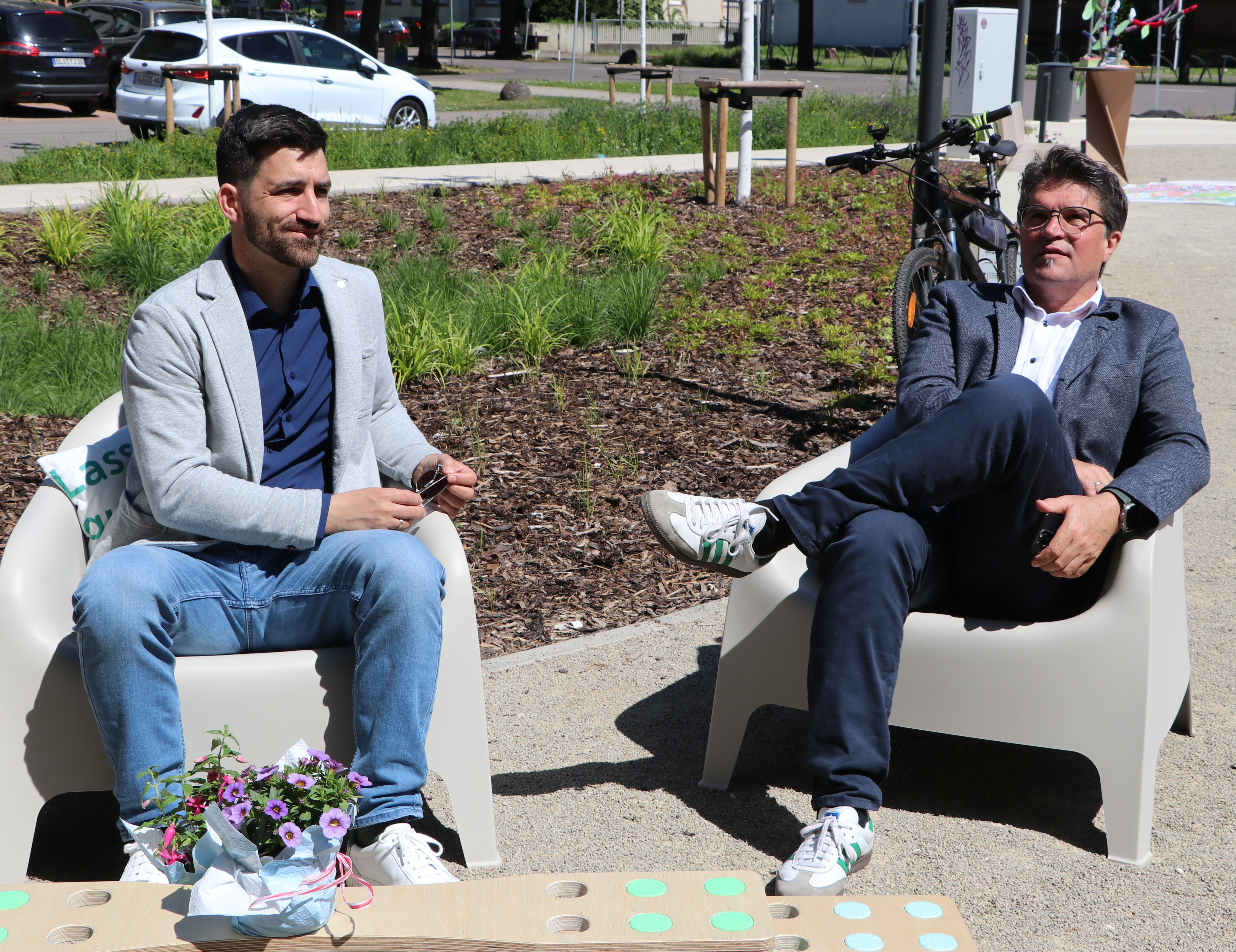 Unter dem Motto „Komm sproochen“ suchten Bürgermeister Carsten Quirin und Beigeordneter Gerald Purucker das direkte Gespräch mit den Bürgerinnen und Bürgern. Ebenfalls im Fokus stand das Quartiersmanagement „on Tour“: Quartiersmanagerin Jessica Fischer und Dr. Viola Kirchner von der Stabsstelle Sozialer Zusammenhalt – die den Tag federführend geplant hatten – stellten ihre Arbeit vor und gaben Einblicke in laufende Projekte. Weitere Programmpunkte waren eine Führung über den neu gestalteten Gutenbergplatz, ein begehbarer Stadtplan mit Citymanagerin Kirsten Cortez sowie Informationen der AG Klimastark zu ihrem ehrenamtlichen Engagement für den Klimaschutz.