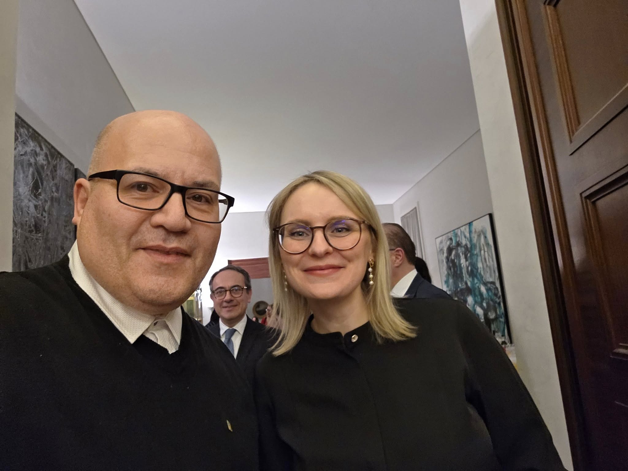 Am 11. Dezember folgte die Abschlussveranstaltung „70 Jahre Anwerbeabkommen” in der Italienischen Botschaft in Berlin. In Anwesenheit von diplomatischen Vertreterinnen und Vertretern, zivilgesellschaftlichen Organisationen sowie Zeitzeuginnen und Zeitzeugen wurde die Migrationsgeschichte der italienischen Familien in Deutschland gewürdigt und in den europäischen Kontext eingeordnet. Die Veranstaltung markierte den offiziellen Abschluss des Jubiläumsjahres und betonte die Bedeutung einer modernen, inklusiven Erinnerungskultur. Zudem hatte er die Gelegenheit, mit Natalie Pawlik, der Beauftragten der Bundesregierung für Migration, Flüchtlinge und Integration, zu sprechen. In diesem Gespräch diskutierten sie das Anwerbeabkommen zwischen Italien und Deutschland aus dem Jahr 1955, das einen wesentlichen Beitrag zur Migration italienischer Staatsbürger nach Deutschland leistete. Die beiden tauschten sich über die historischen und gesellschaftlichen Auswirkungen dieses Abkommens aus, durch das nicht nur Arbeitskräfte nach Deutschland kamen, sondern das auch die Grundlage für eine lebendige Gemeinschaft bildete, die heute integraler Bestandteil der deutschen Gesellschaft ist.