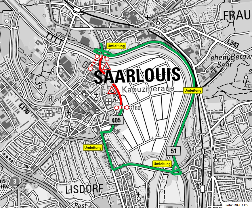 Am Montag, den 4. September 2023, beginnt der Landesbetrieb für Straßenbau (LfS) im Rahmen der Sanierung der B 405 in Saarlouis mit dem zweiten Bauabschnitt. Die Arbeiten erstrecken sich von der Zufahrt zum Marienkrankenhaus St. Elisabeth („Im Glacis“) bis zur „Peter-Neis-Brücke“ und werden wie zuvor unter Vollsperrung durchgeführt.