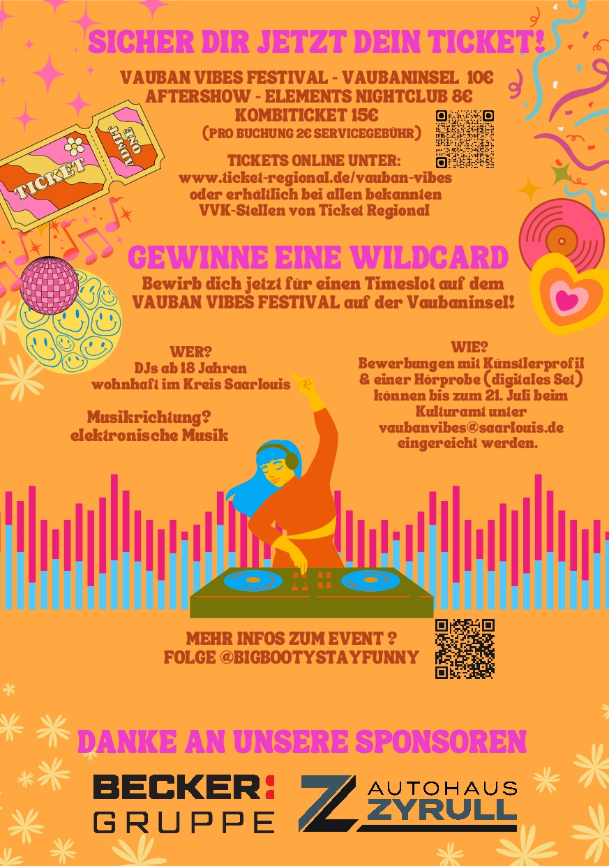 Da die lokale Künstlerförderung beiden Kooperationspartnern sehr am Herzen liegt, gibt es als besonderes Special die Vergabe einer „Wildcard“- interessierte Musiker/DJs können einen Auftritt in der ersten Stunde des Festivals gewinnen! Bedingungen sind ein Mindestalter von 18 Jahren, wohnhaft im Landkreis Saarlouis und natürlich die Leidenschaft zur elektronischen Musik. Bewerbungen mit einem kurzen Künstlerprofil und einer Hörprobe (digitales Set) können bis zum 21. Juli beim Kulturamt unter vauban.vibes@saarlouis.de eingereicht werden. Weitere Informationen erhält man auch unter 06831/ 69 89 -013.