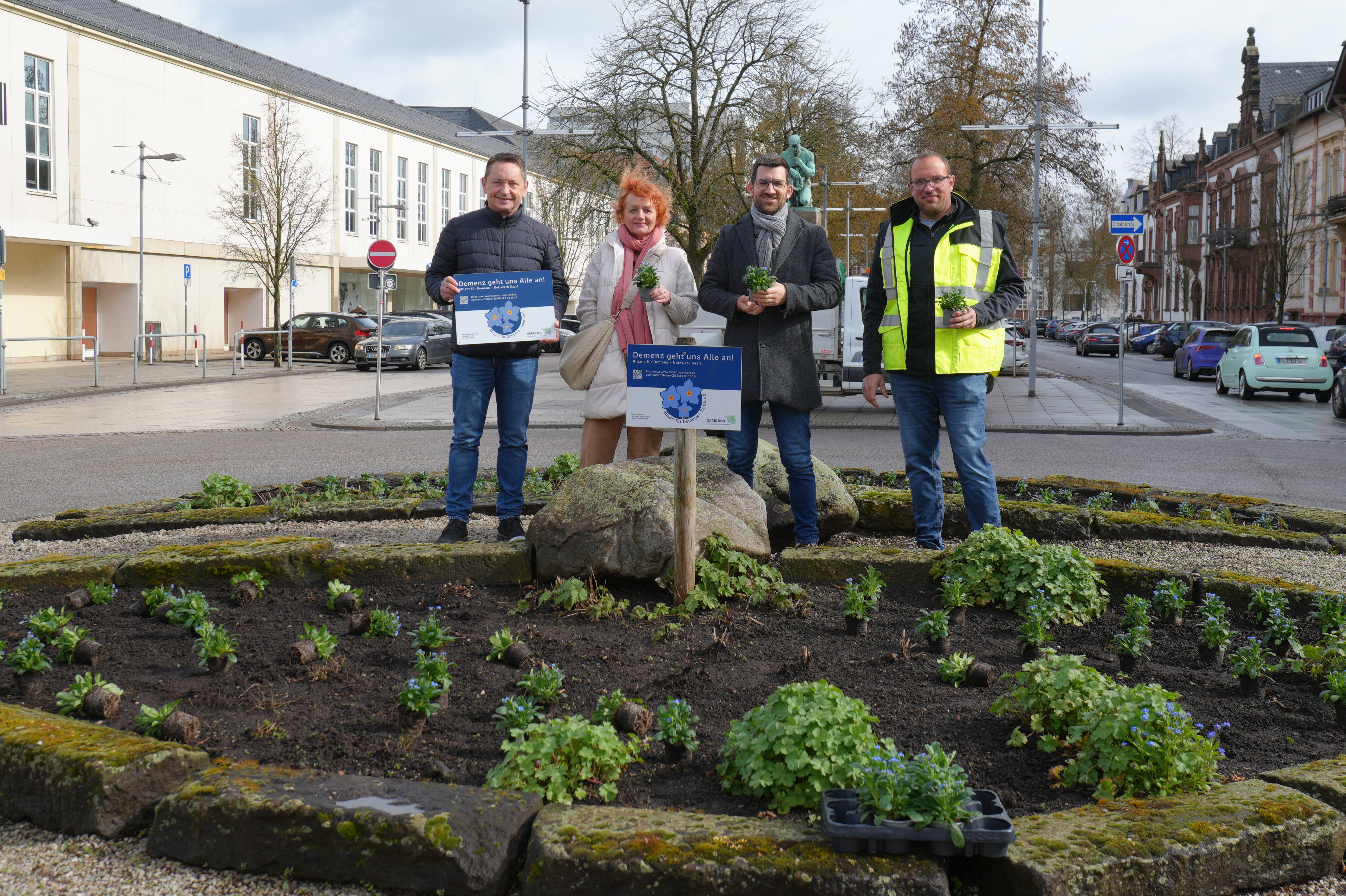 An der diesjährigen Pflanzaktion nahmen Bürgermeister Carsten Quirin, Amtsleiterin Sabine Schmitt und Andreas Sauder von der Landesfachstelle Demenz sowie Mitarbeiterinnen und Mitarbeiter des Neuen Betriebshofes Saarlouis teil. Zu Beginn der Woche setzten sie die Vergissmeinnicht-Blumen sorgfältig in die Erde und platzierten das Hinweisschild, das über die Bedeutung der Aktion informiert.