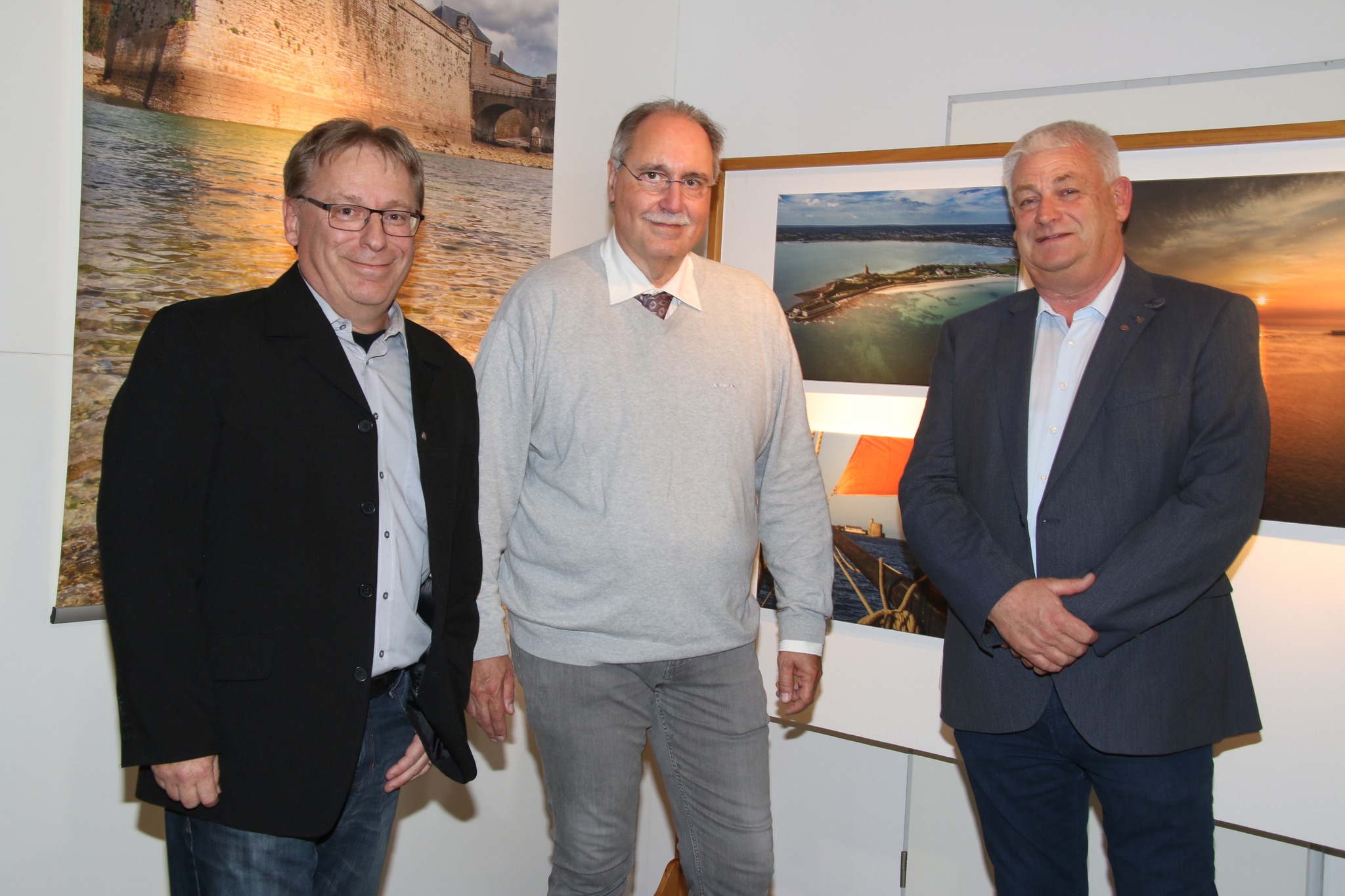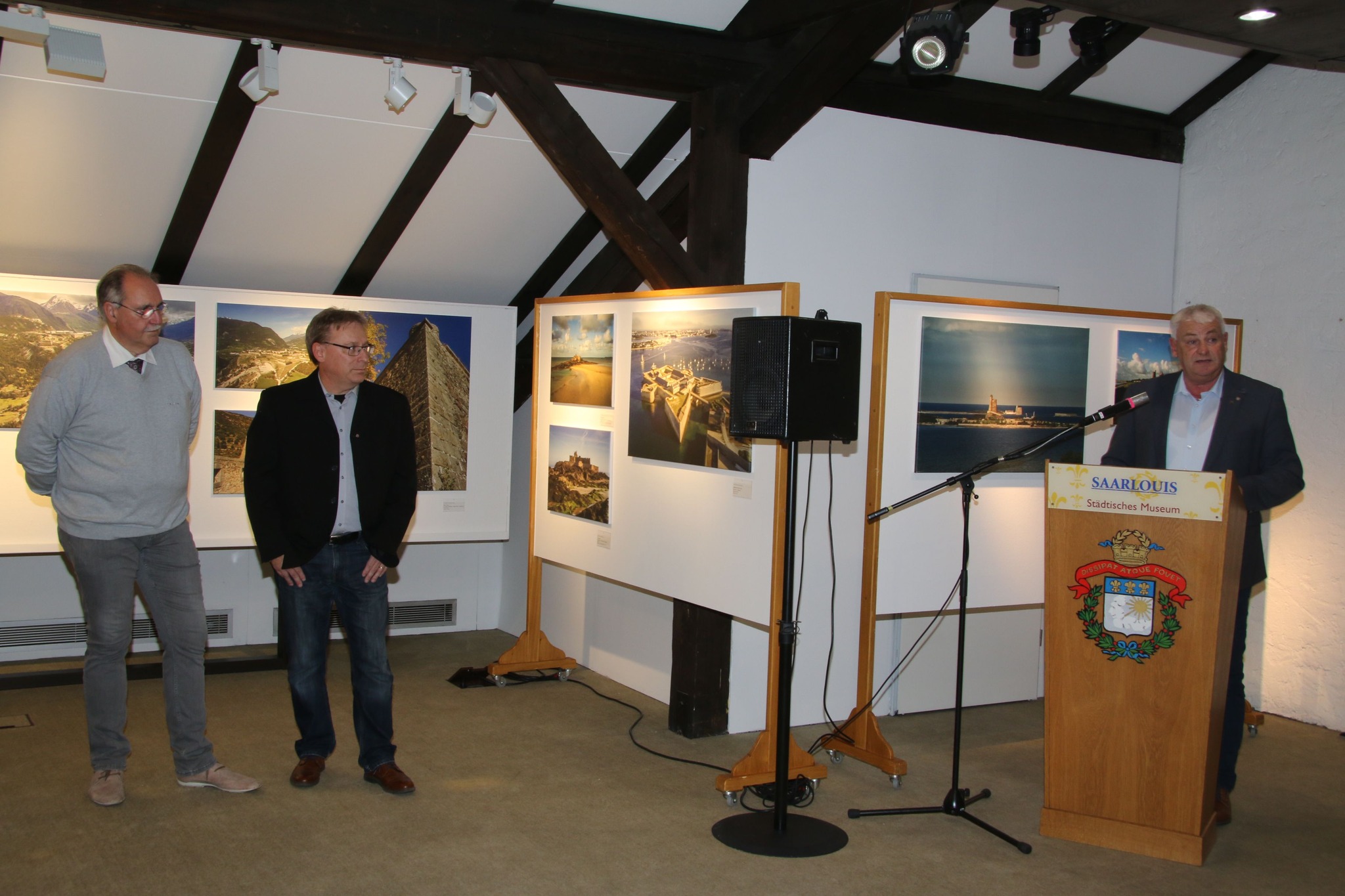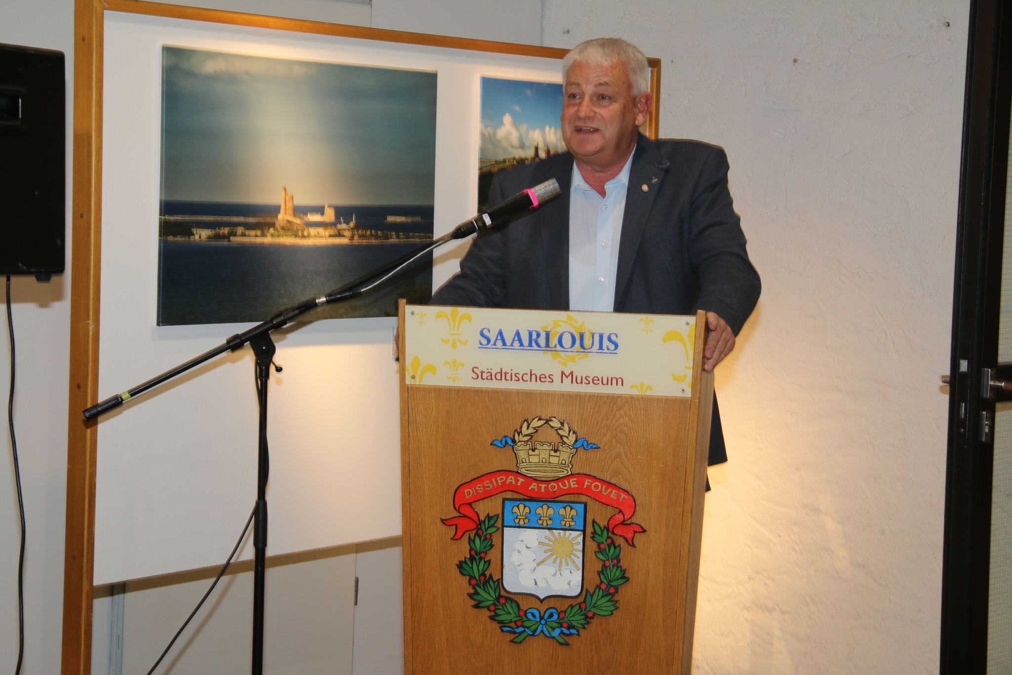 Benedikt Loew, Leiter des Städtischen Museums führte anschließend in die Ausstellung seines Freundes ein. Er berichtete: „Ich kann mich noch sehr gut daran erinnern als Jean-Marie mir während der Mittagspause beim Festungs-Forums 2017 ein paar Bilder auf seinem Tablett zeigte, die er tags zuvor, auf seiner Anreise nach Saarlouis, bei einem Zwischenstopp in Bitche aufgenommen hatte. Mit seiner Drohne hatte er die Zitadelle fotografiert und ich darf sagen, dass ich schwer beindruckt war. Zwei Jahre später, bei der nächsten Tagung hier in Saarlouis, präsentierte er mir viele weitere Aufnahmen von seinen Reisen. Hier wurde dann auch die Idee einer Ausstellung erstmals besprochen. Endgültig festgezurrt haben wir das Projekt dann im Februar 2020. Wenige Tage vor dem Ausbruch der Pandemie hatten wir uns in Colmar bei Jean-Marie zu Hause getroffen. Beste Grüße an dieser Stelle noch bitte an deine Frau und besten Dank auch noch einmal für das feine Mittagessen“.