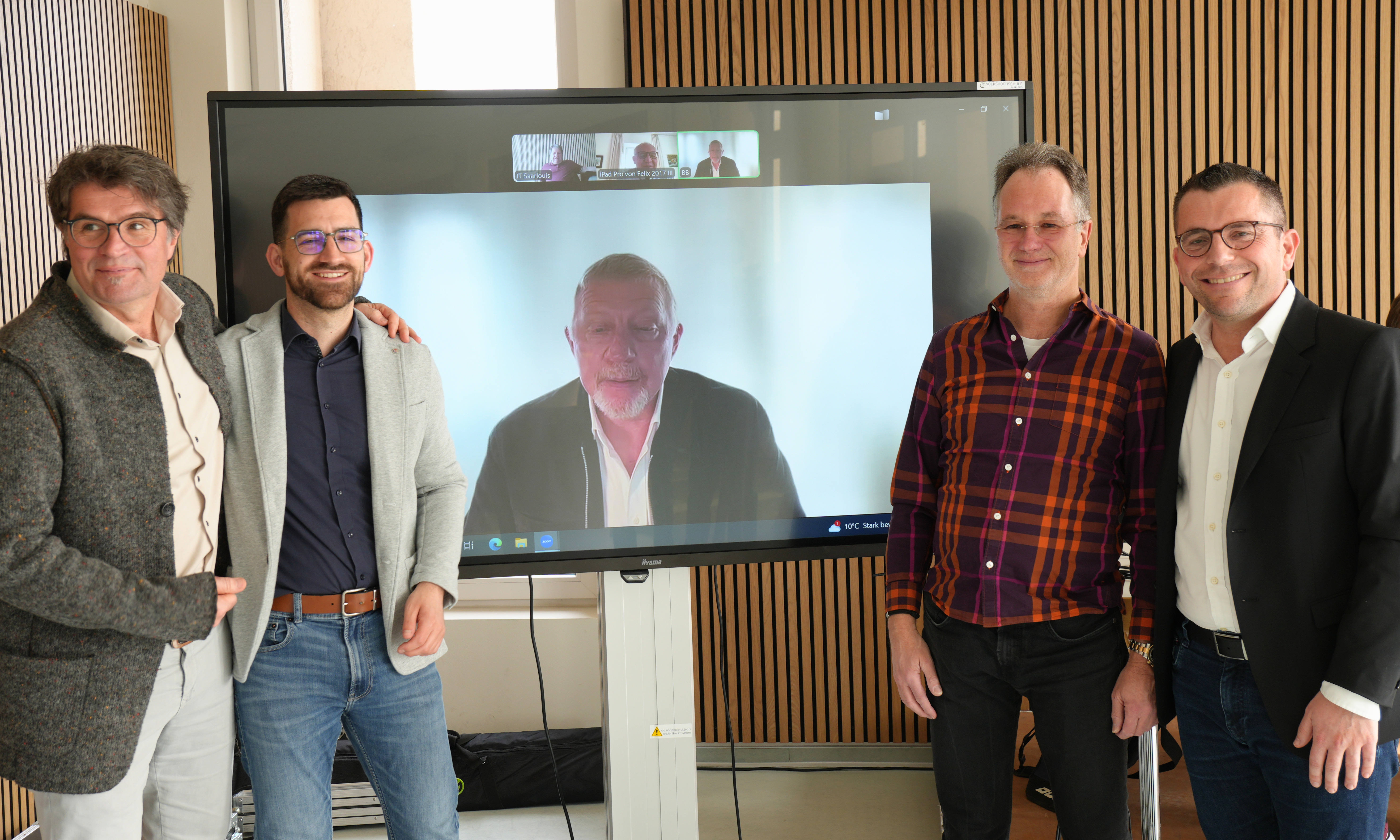 v.l.: Beigeordneter Gerald Purucker, Bürgermeister Carsten Quirin, live zugeschaltet – Tennislegende Boris Becker, Frank Schreiner (Donic) und Oberbürgermeister Marc Speicher.