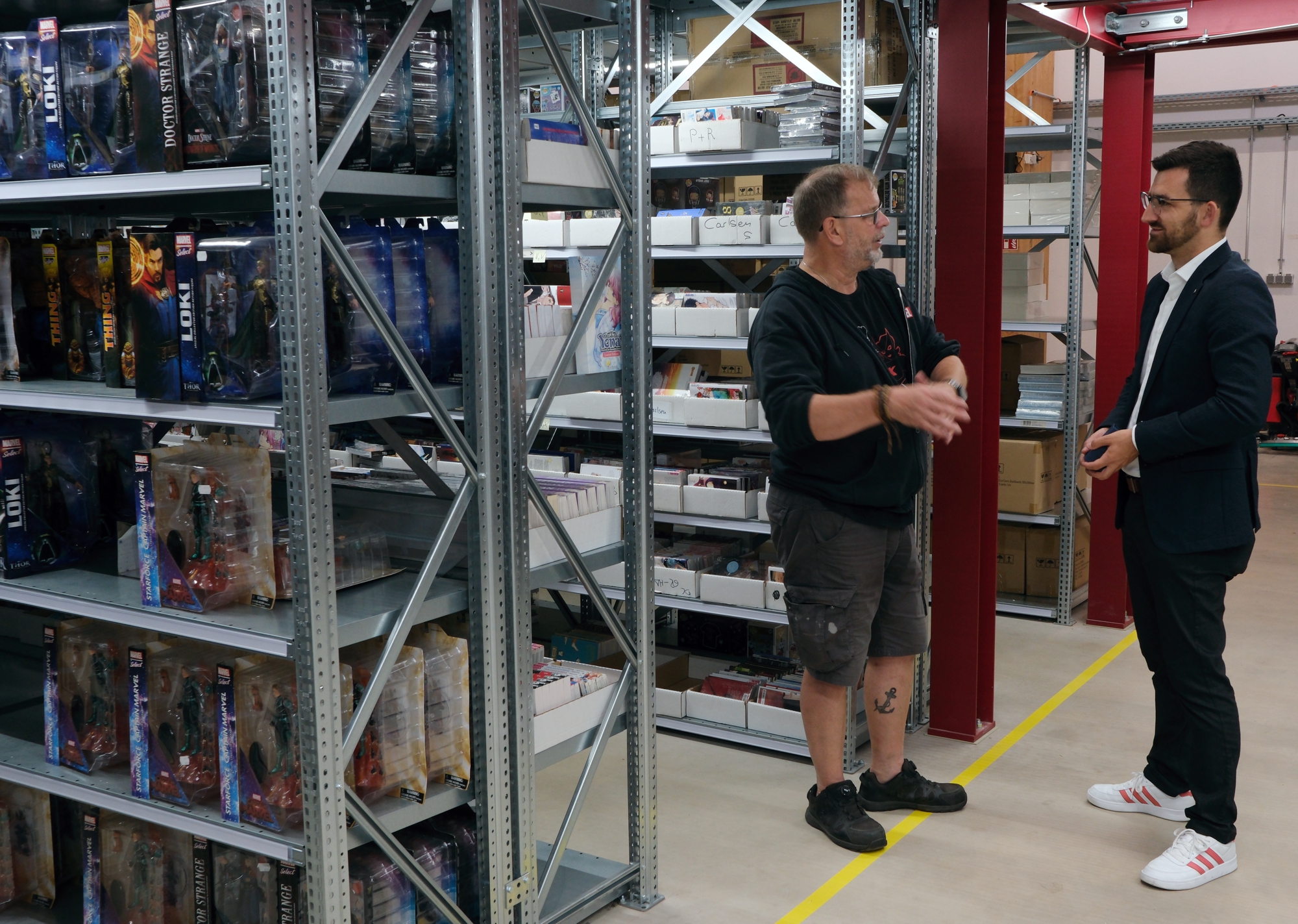 Was haben Gotham City, Springfield und Darth Vaders Todesstern gemeinsam? Sie alle treffen im Industriegebiet Lisdorfer Berg aufeinander – denn hier hat die X-Comics GmbH seit rund einem Jahr ihren Hauptsitz. Herzstück, neben den neuen Büroräumlichkeiten, ist die großen Halle mit ihrer topmodernen Lagerinfrastruktur, die nicht nur ein umfangreiches Sortiment an Comics, Merchandise und Sammlerzubehör bereithält, sondern die jetzt schon für künftige Entwicklungen bereitsteht. Vor Ort machte sich Bürgermeister Carsten Quirin im Rahmen eines Unternehmensbesuches ein eigenes Bild von X-Comics und sprach mit Geschäftsführer Alexander Fischer über die Unternehmensgeschichte, das Angebot von X-Comics und über die Investitionen auf dem Lisdorfer Berg.