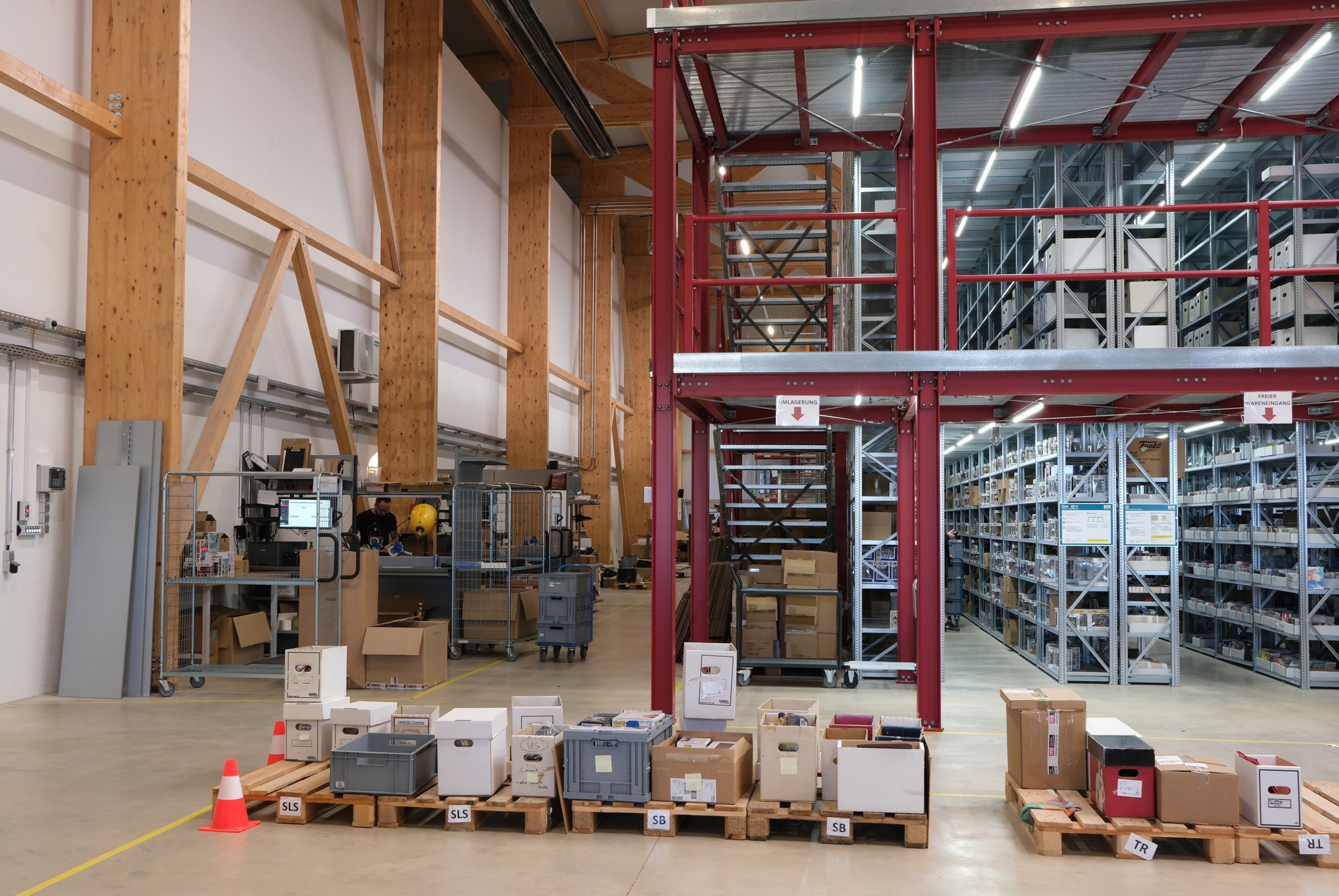 Eine moderne, isolierte Holzhalle mit Lagertechnik in Unternehmensfarben: Von hier aus beliefert X-Comics seine Filialen und Online-Kunden mit Comics, Merchandise und Zubehör.