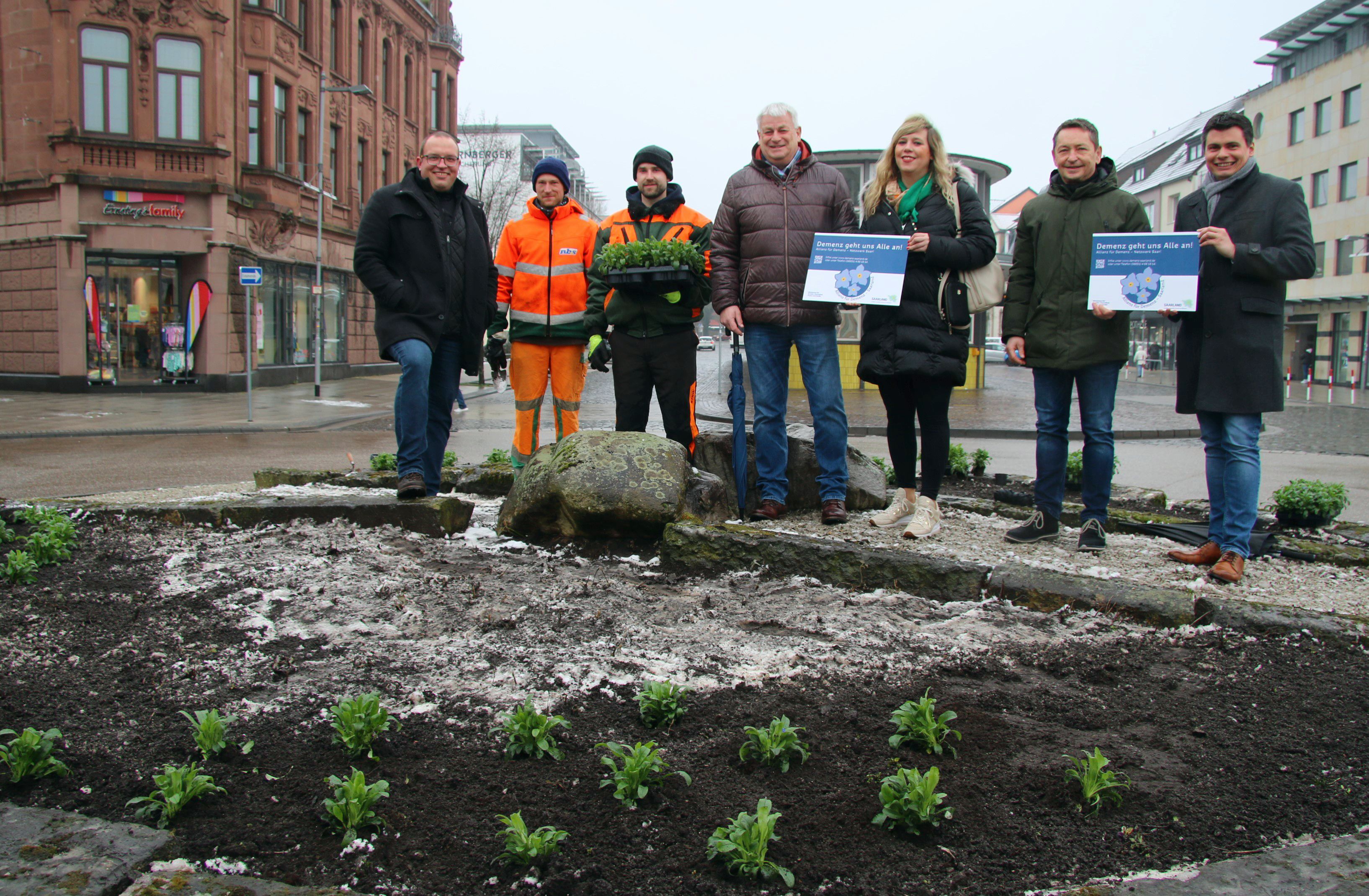 „Bei so einem wichtigen Thema hält uns auch Regen oder Schnee nicht davon ab, mitzumachen“, sagte Oberbürgermeister Peter Demmer und bedankte sich herzlich bei Christian Blees und Robin Volz von der Grünflächenabteilung des NBS, die Anfang März trotz widriger Wetterverhältnisse behutsam 120 Vergiss-mein-nicht-Pflanzen in die Erde des Verkehrs-Kreisels am Kleinen Markt setzten. Ebenfalls ein Dankeschön richtete Demmer an die Organisatoren in Saarlouis, Andreas Sauder von der Landesfachstelle Demenz sowie Vanessa Wassong und Dominik Lieblang vom Neuen Betriebshof.
