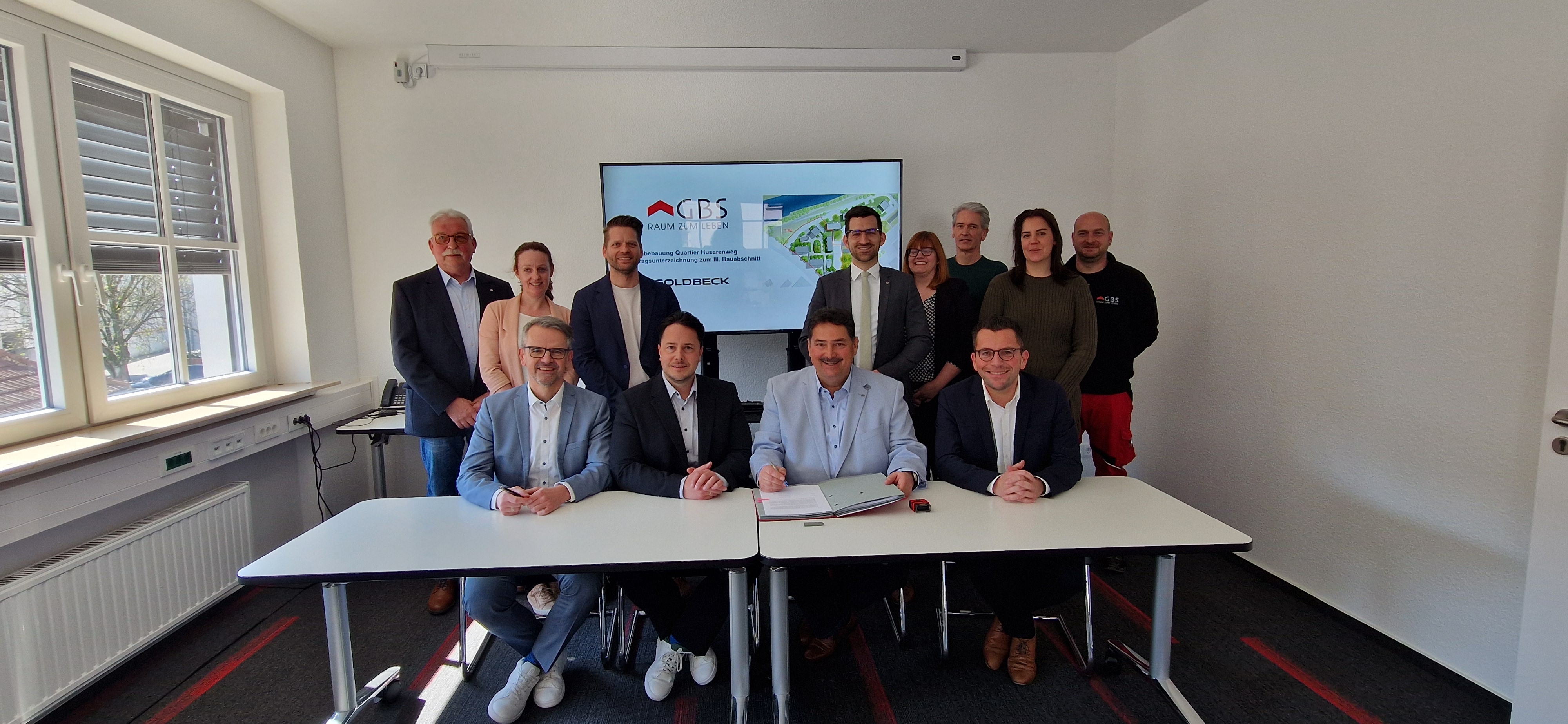 Geschäftsführer Knut Kempeni unterzeichnete in Anwesenheit von Aufsichtsratsvorsitzenden und Oberbürgermeister Marc Speicher und Bürgermeister Carsten Quirin den Bauvertrag mit der Firma Goldbeck, vertreten durch Dominik Stumpf und Daniel Littgen.