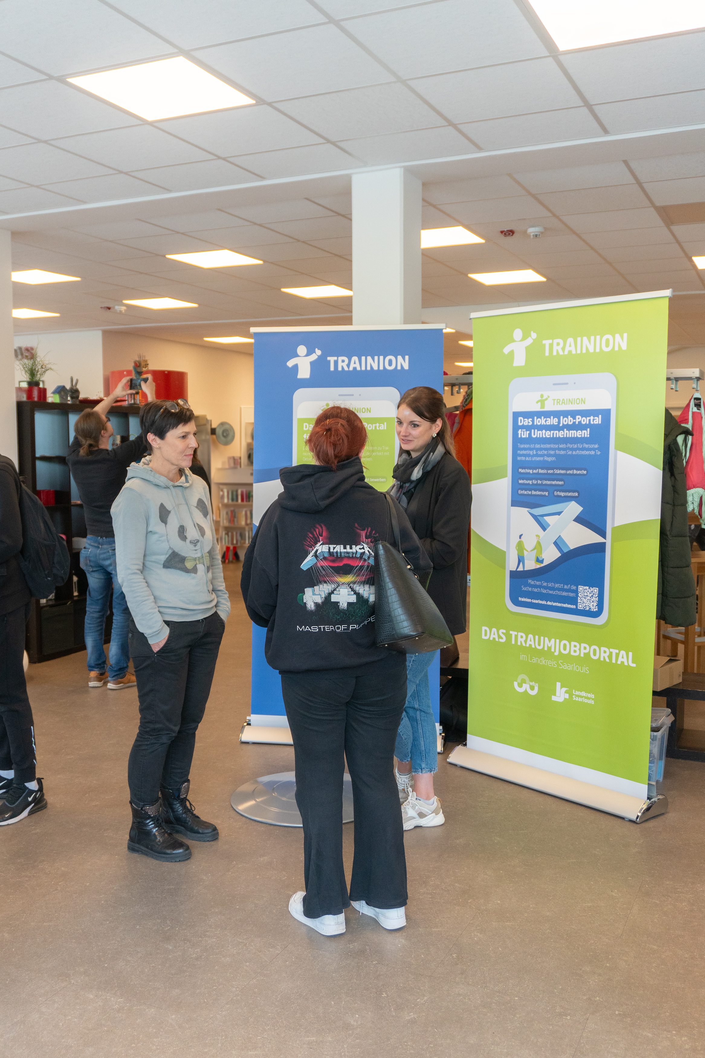 Allgemeine Fragen rund um die Themen Bundesfreiwilligendienste, Ausbildung und Umschulung beantworteten die Bundesagentur für Arbeit sowie das Bundesamt für Familie und zivilgesellschaftliche Aufgaben. TRAINION, das Praktikums- und Ausbildungsportal des Landkreises Saarlouis, war ebenfalls mit einem Stand vertreten und brachte den jungen Gästen sein Angebot näher: Seit 2023 betreibt der Kreis seine eigene Online-Plattform, auf der Interessierte eine große Auswahl an regionalen Praktikums- und Ausbildungsangeboten durchstöbern und auf diesem Weg ihr berufliches „Match“ finden können.