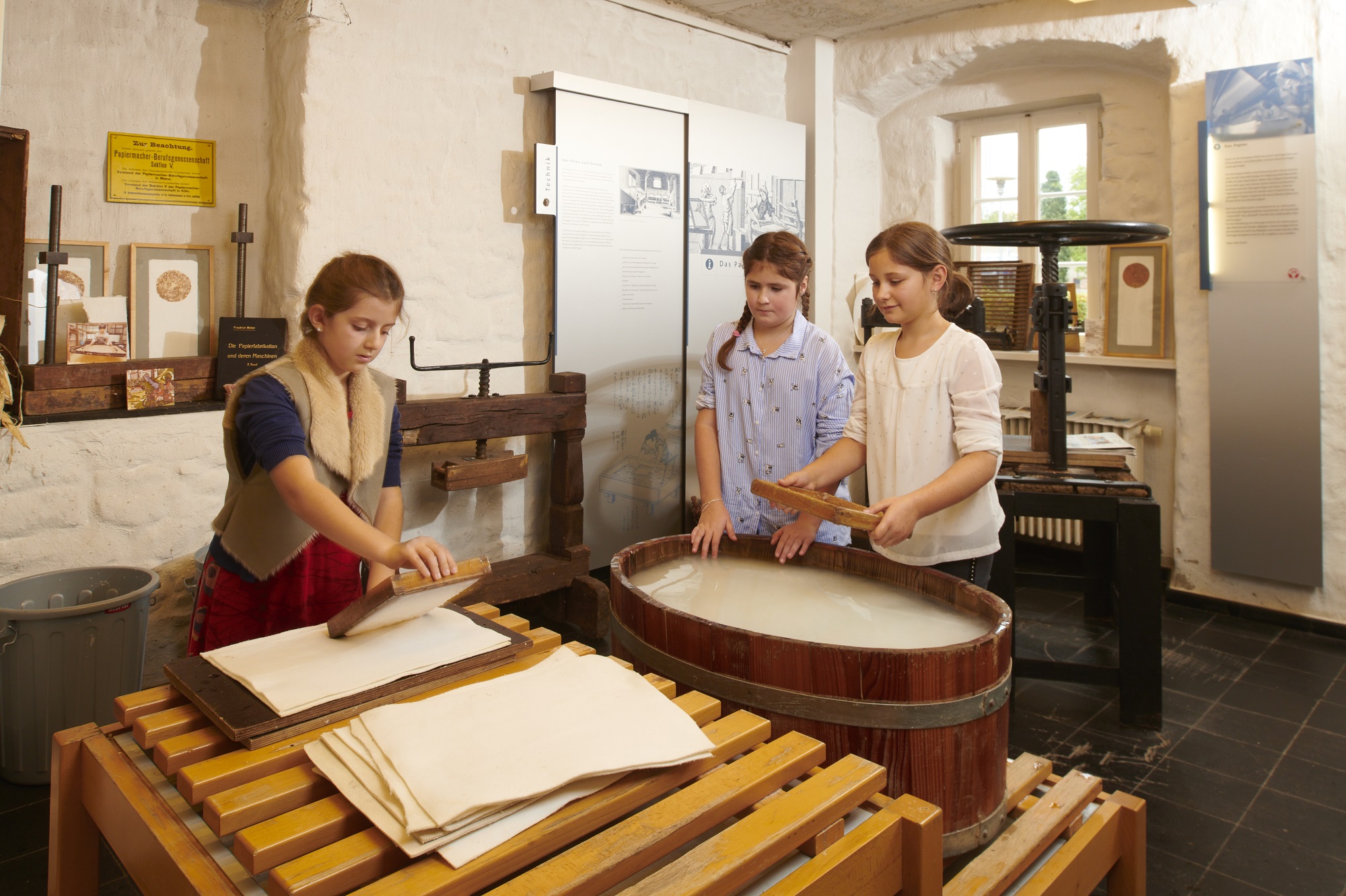 Papierwerkstatt im Deutschen Zeitungsmuseum – beim Papierschöpfen entdecken die Kinder-UNI-Teilnehmenden, wie aus Wasser und Fasern ein eigenes Blatt entsteht.