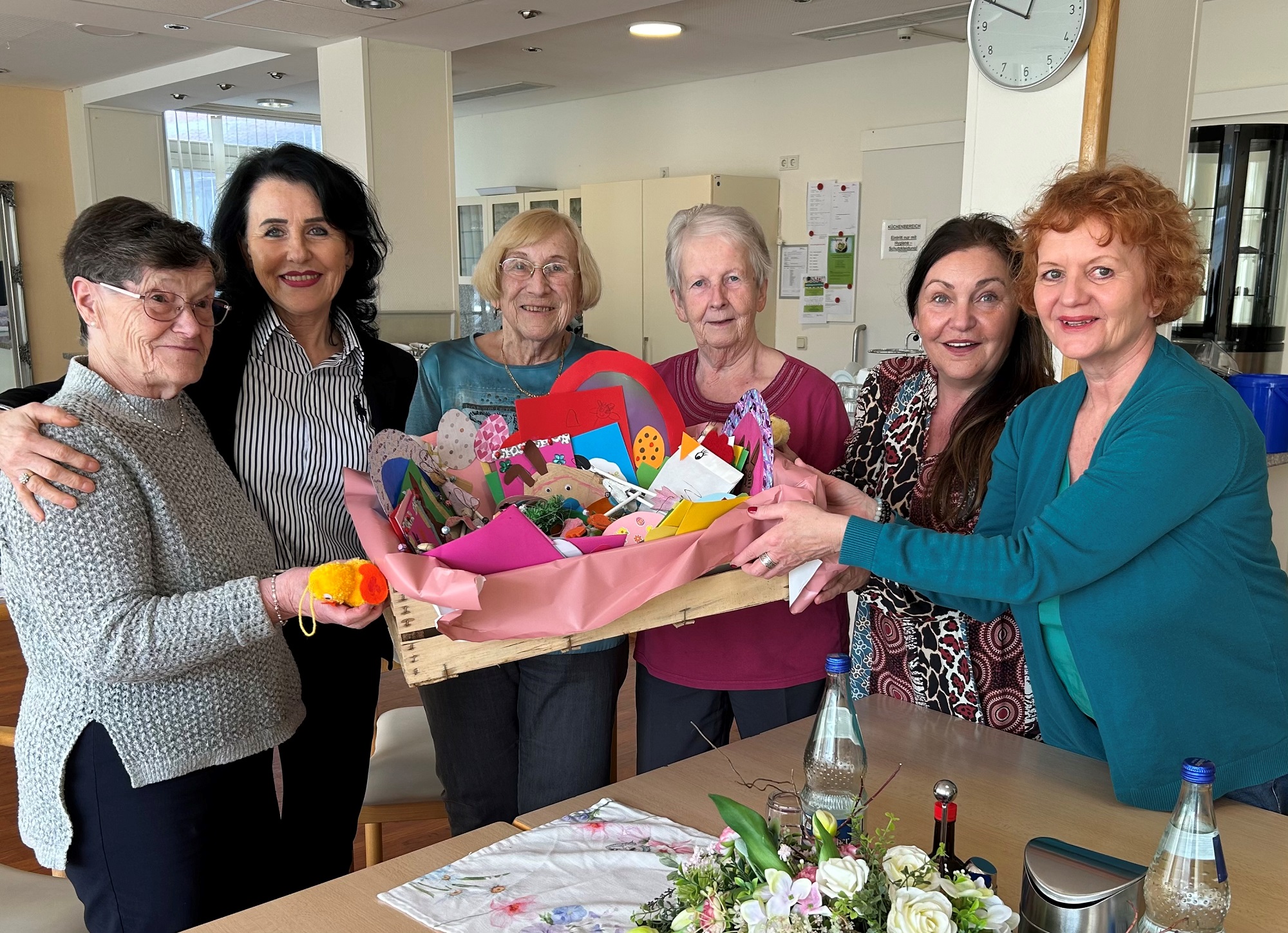 Übergabe der Osterbasteleien in der AWO Seniorenresidenz mit Mathilde Gehl, Edith Jarzombek, Gisela Heib, Regine Kretschmar, Heike Goebel und Sabine Schmitt. (von links) Foto: Beata Bensz