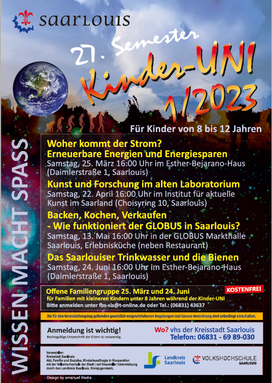 Kinder zwischen 8 und 12 Jahren sind herzlich eingeladen, den spannenden Themen zu lauschen und dabei viel Wissenswertes zu erfahren. Los geht’s am Samstag, 25. März um 16 Uhr mit einem Vortrag zum Thema „Strom und Erneuerbare Energien“. Guillem Tänzer von den Saarlouiser Stadtwerken erklärt, woher der Strom kommt, aber auch, wie man Strom sparen kann. Am Samstag 22. April stehen Kunst und Kultur im Mittelpunkt der Kinder-UNI. Dr. Andreas Bayer, Direktor des Instituts für aktuelle Kunst, lädt zu einem Besuch in das alte Laboratorium und führt persönlich durch die Ausstellung. Hier erfahren die Kinder, dass Bilder nicht zwangsläufig immer in einem Rahmen an der Wand hängen. Es gibt es noch viele andere Möglichkeiten, die Dr. Bayer gemeinsam mit der Künstlerin Claudia Vogel erklärt. Im Anschluss sind die Teilnehmenden eingeladen, selbst künstlerisch aktiv zu werden. Wer immer schon mal wissen wollte, was so alles hinter den Kulissen eines Supermarktes passiert, sollte den Besuch im Saarlouiser GLOBUS am Samstag, 13. Mai nicht verpassen. Julia Petry und Stephan Hauck sind erfahrene Globus-Mitarbeiter und erklären den Weg der Waren vom Hersteller bis ins Regal. Sie zeigen den Besucher*innen, wo das leckere Brot gebacken wird und was so alles in der Wurst steckt. Gern beantworten sie Fragen und am Schluss gibt’s noch eine kleine Verkostung. Das Semester endet mit einem Vortrag von Martin Entenmann am 24. Juni. Er erklärt, wie das Grundwasser aus dem Boden gepumpt wird und wie die Saarlouiser Stadtwerke es letztendlich in gesundes Trinkwasser verwandeln und was Bienen und Imker damit zu tun haben.
