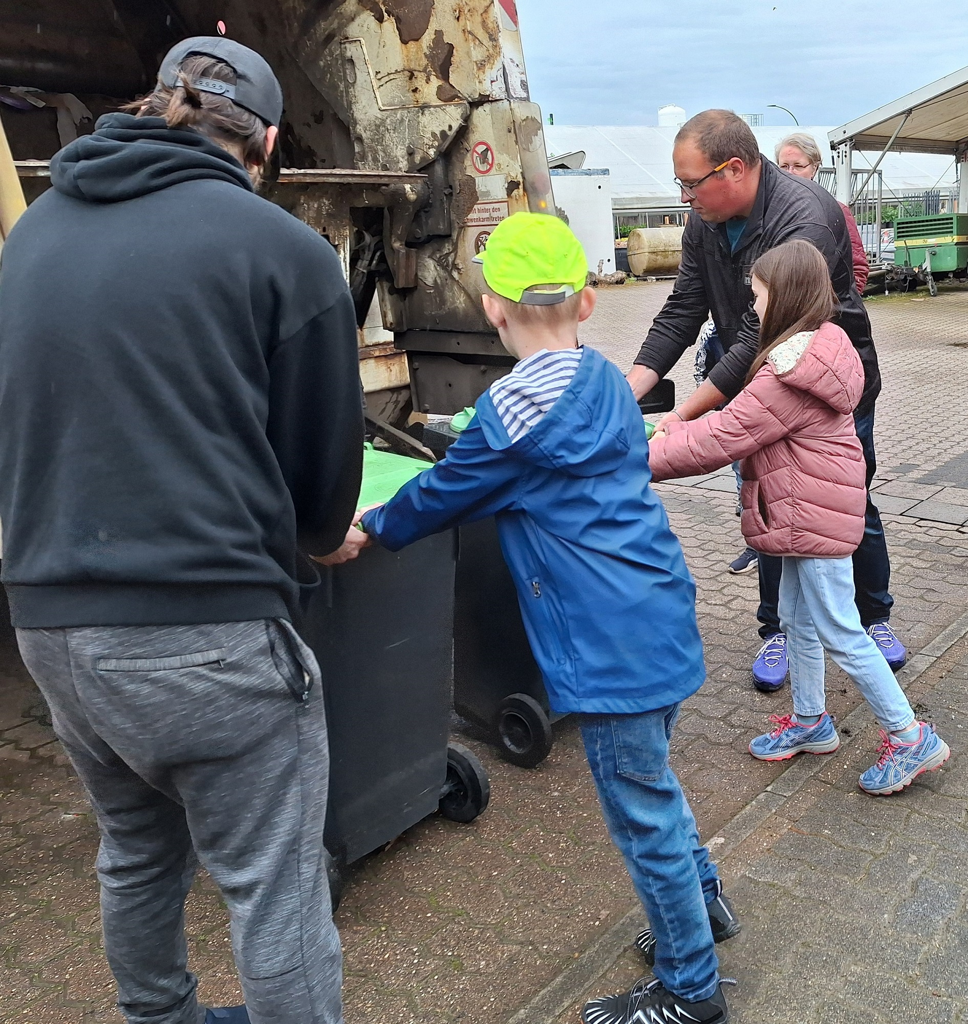 Zusammen mit Virginia Schors und Dominik Lieblang durften die Kids auch selbst mal eine Mülltonne ans Fahrzeug hängen. Welch ein Erlebnis, wann darf man das schon mal als Kind!