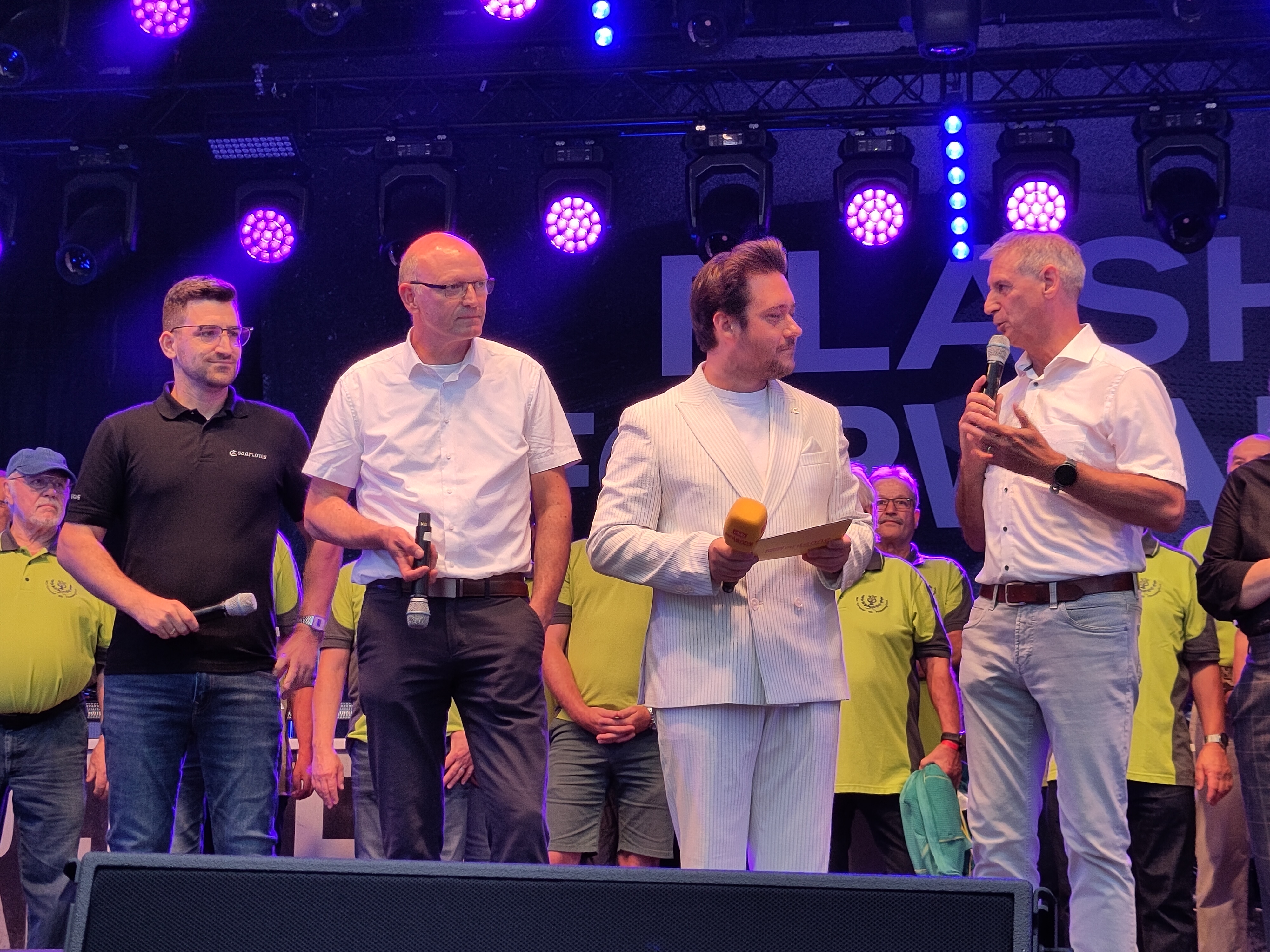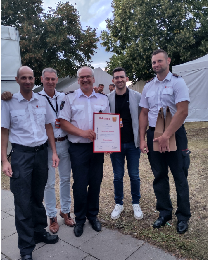 Ebenfalls auf der Hauptbühne gab es eine sehr emotionale Auszeichnung für einen verdienten Saarlouiser: Jörg Schmitz, Löschbezirksführer der Saarlouiser Innenstadt, wurde zum Ehrenmitglied der Freiwilligen Feuerwehr Eisenhüttenstadt ernannt und damit für sein „jahrzehntelanges Engagement für die Partnerschaft der beiden Wehren geehrt, die in diesem Jahr ihr 35-jähriges Bestehen feiert“, so die Laudatio von Bürgermeister Frank Balzer und der Eisenhüttenstädter Wehrführung.