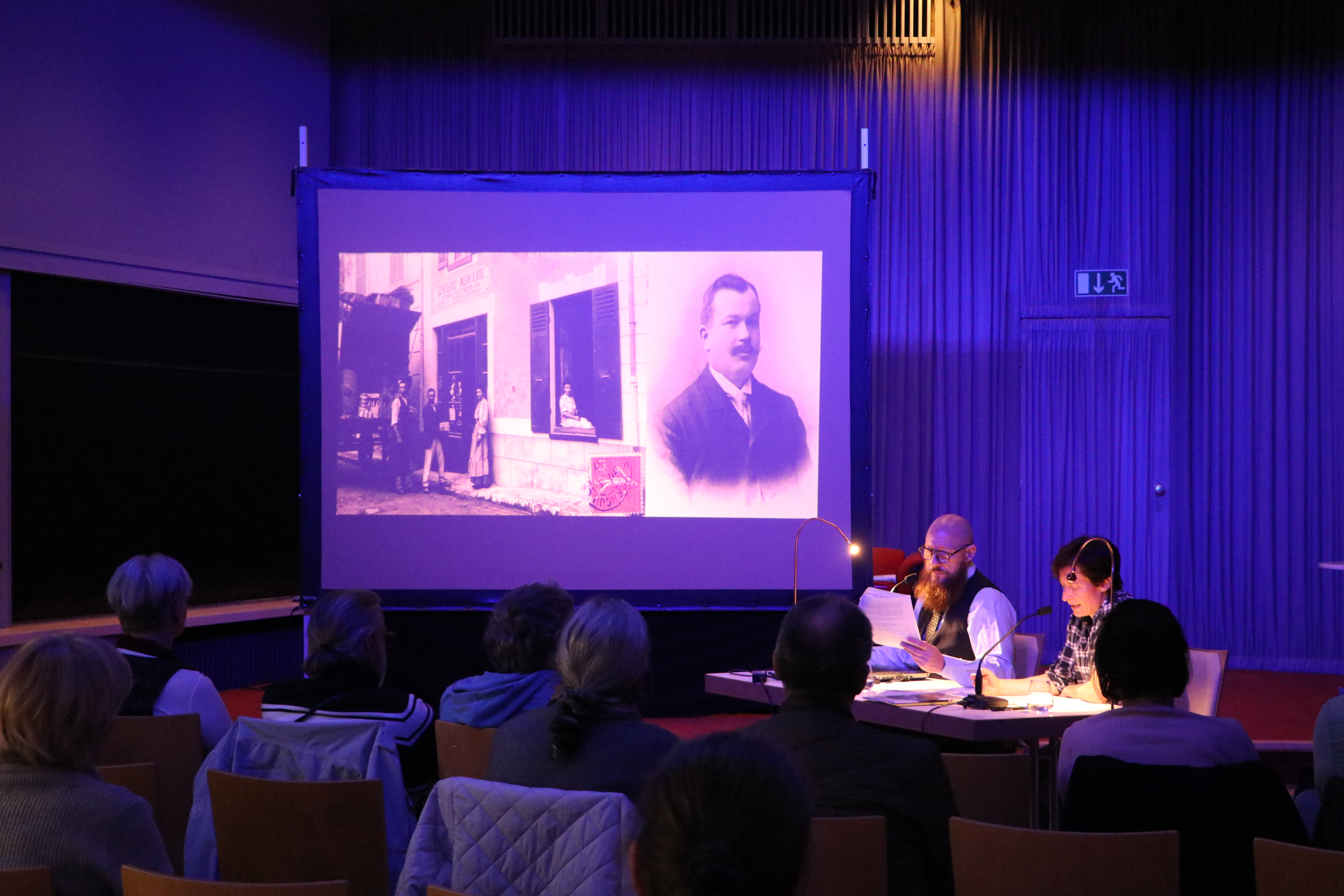Einige Interessierte waren an jenem Dienstagabend ins Studio im Theater am Ring gekommen um mehr aus dem außergewöhnlichen Leben des Octave Pelletier zu erfahren. Sainte-Martine selbst hielt den bebilderten Vortrag über die Recherchen zu seinem Urgroßonkel in französischer Sprache, die Übersetzung übernahm Christiane Bähr, Leitung der Stabstelle für Grenzüberschreitende Zusammenarbeit und internationale Kooperationen.