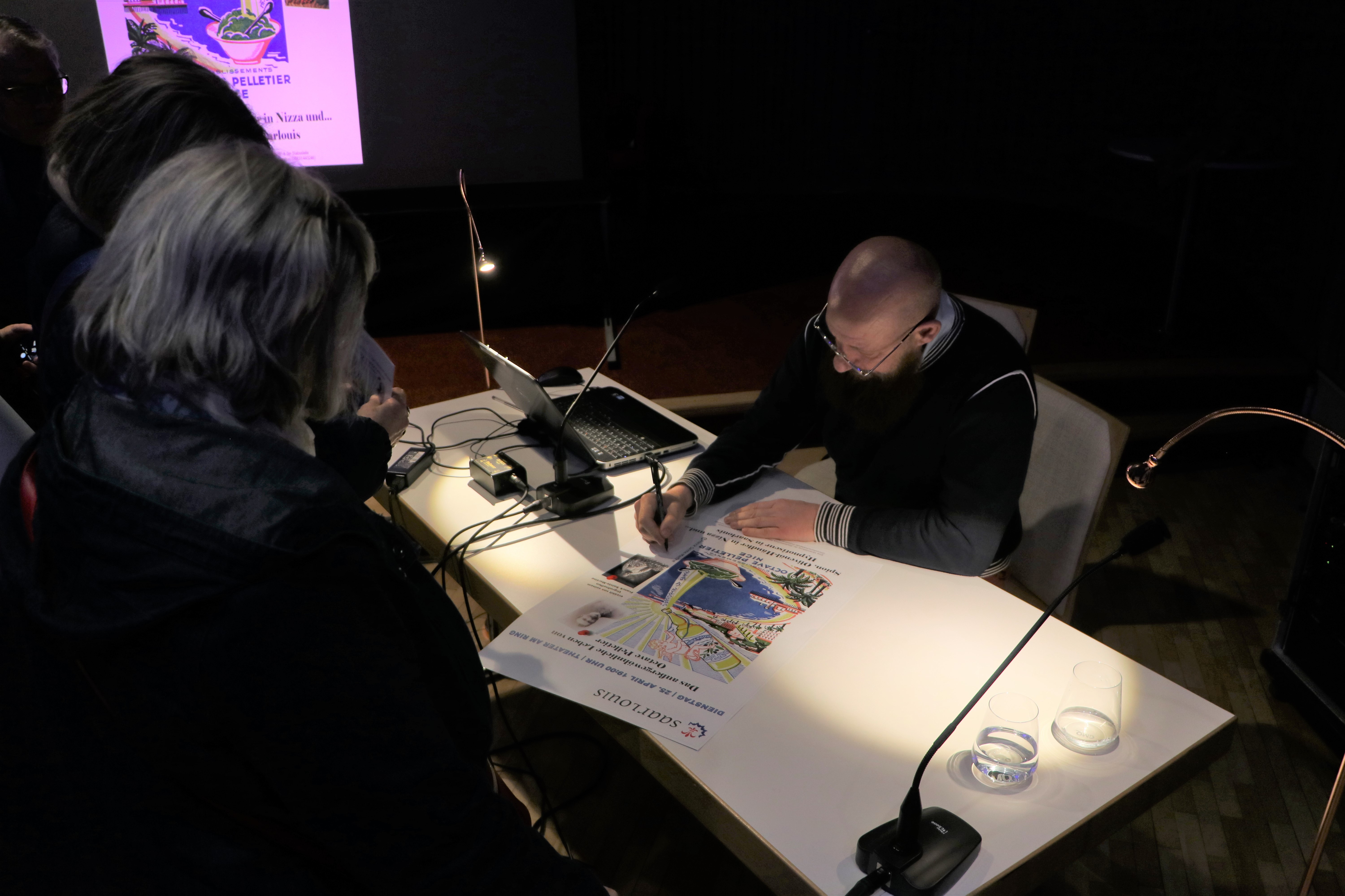 Sainte-Martine beim Untersschreiben des Veranstaltungsplakates für eine Besucherin. (Foto: Sophia Tull)