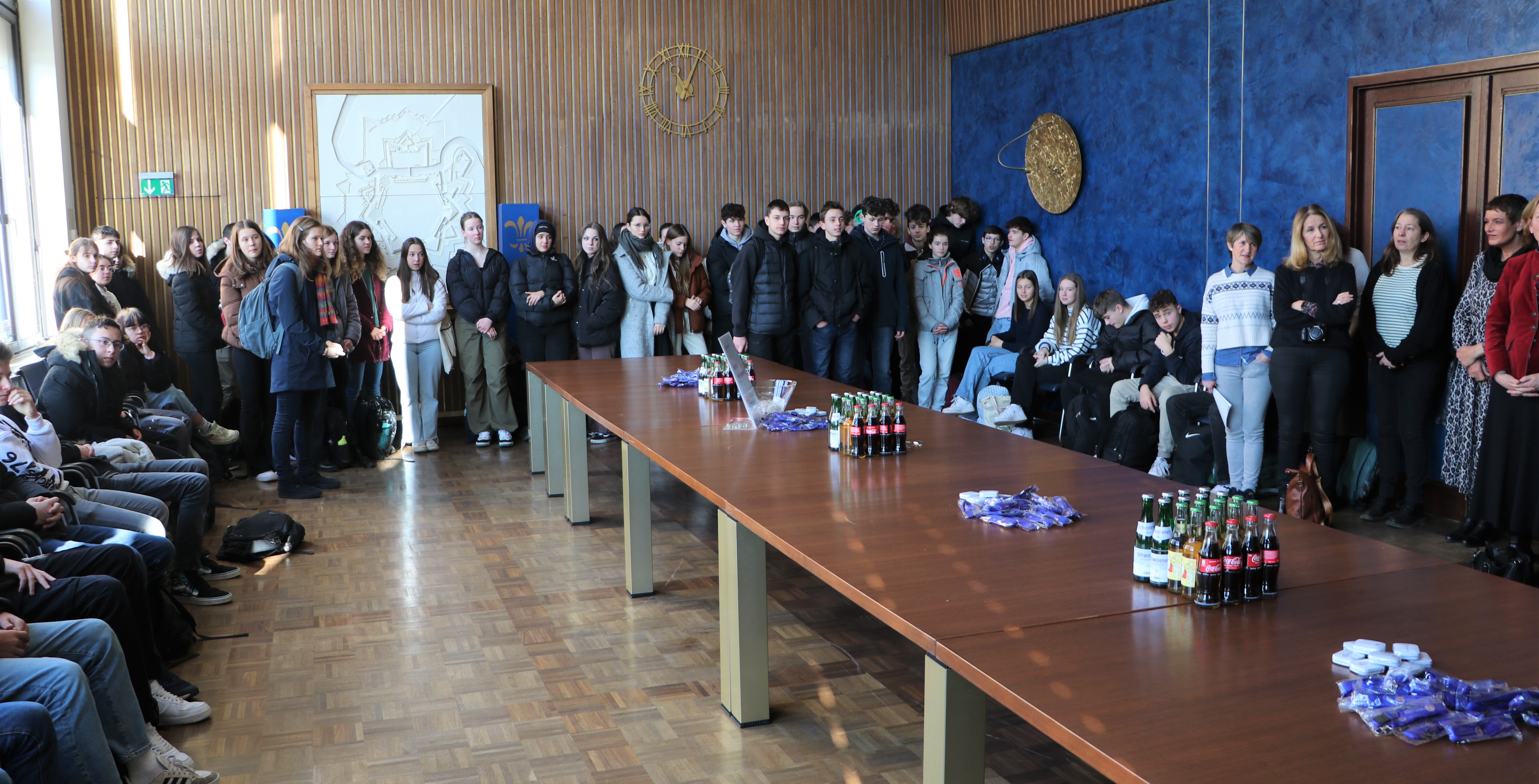 Die Gruppe bestehend aus 33 Teilnehmerinnen und Teilnehmern von französischer Seite und eben so vielen Schülerinnen und Schülern aus Saarlouis wurde am letzten Tag des Besuches im Februar von Oberbürgermeister Peter Demmer im Rathaus empfangen.