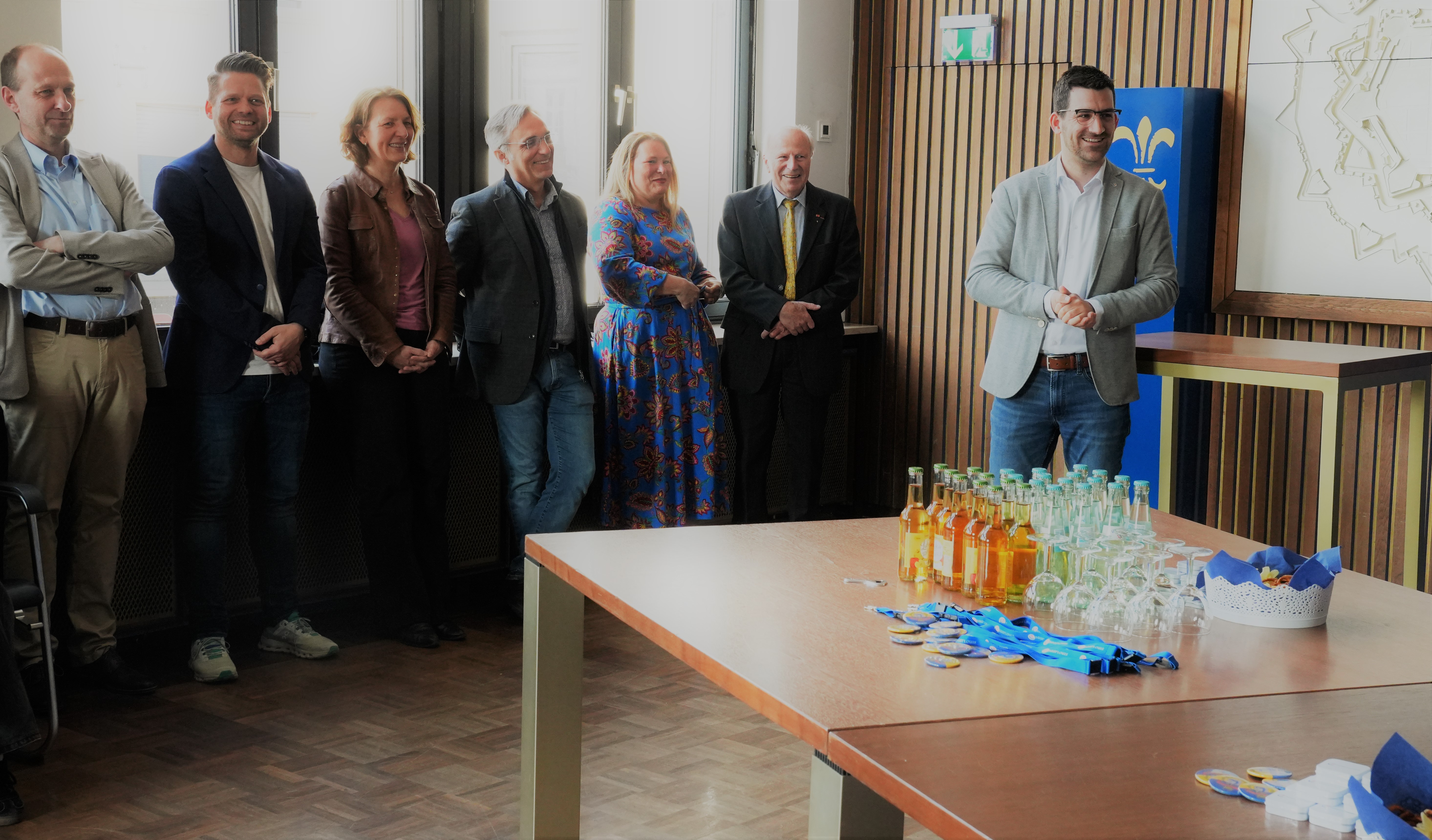 v.l.: Herr Peters (RSG), Haupt- und Personalamtsleiter Herr Guß, Frau von Mörs (SGS), Herr Bravo-Lanyi (MPG), Honorarkonsulin Myriam Bouchon, ehem. Honorarkonsul Michel Bouchon und Bürgermeister Carsten Quirin.