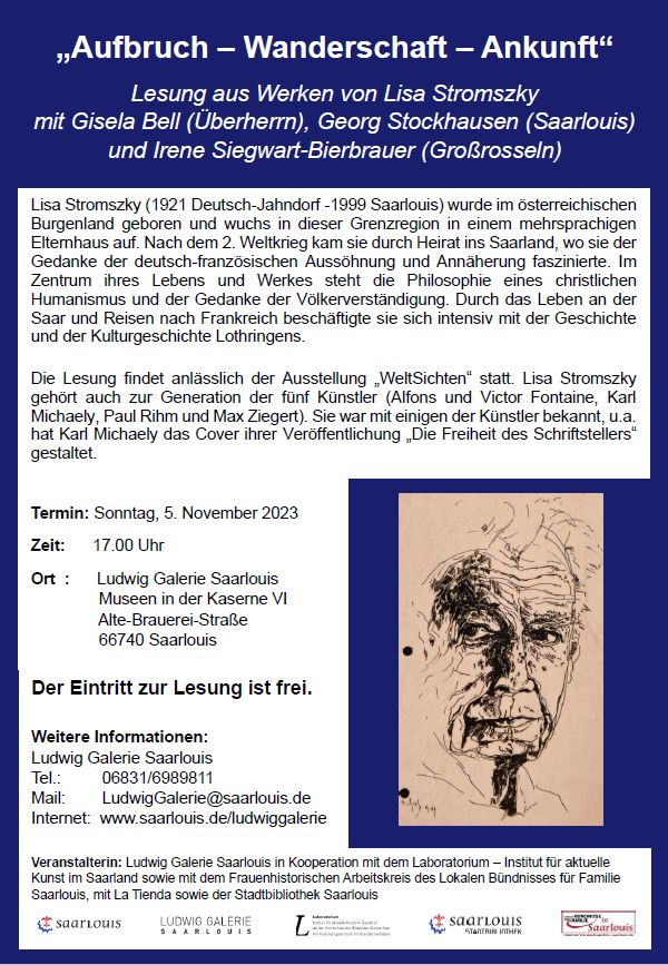 Die Lesung aus Werken von Lisa Stromszky wird veranstaltet von der Ludwig Galerie Saarlouis in Kooperation mit dem Laboratorium – Institut für aktuelle Kunst im Saarland, dem Frauenhistorischen Arbeitskreis des Lokalen Bündnis für Familie Saarlouis, La Tienda sowie der Stadtbibliothek Saarlouis.
