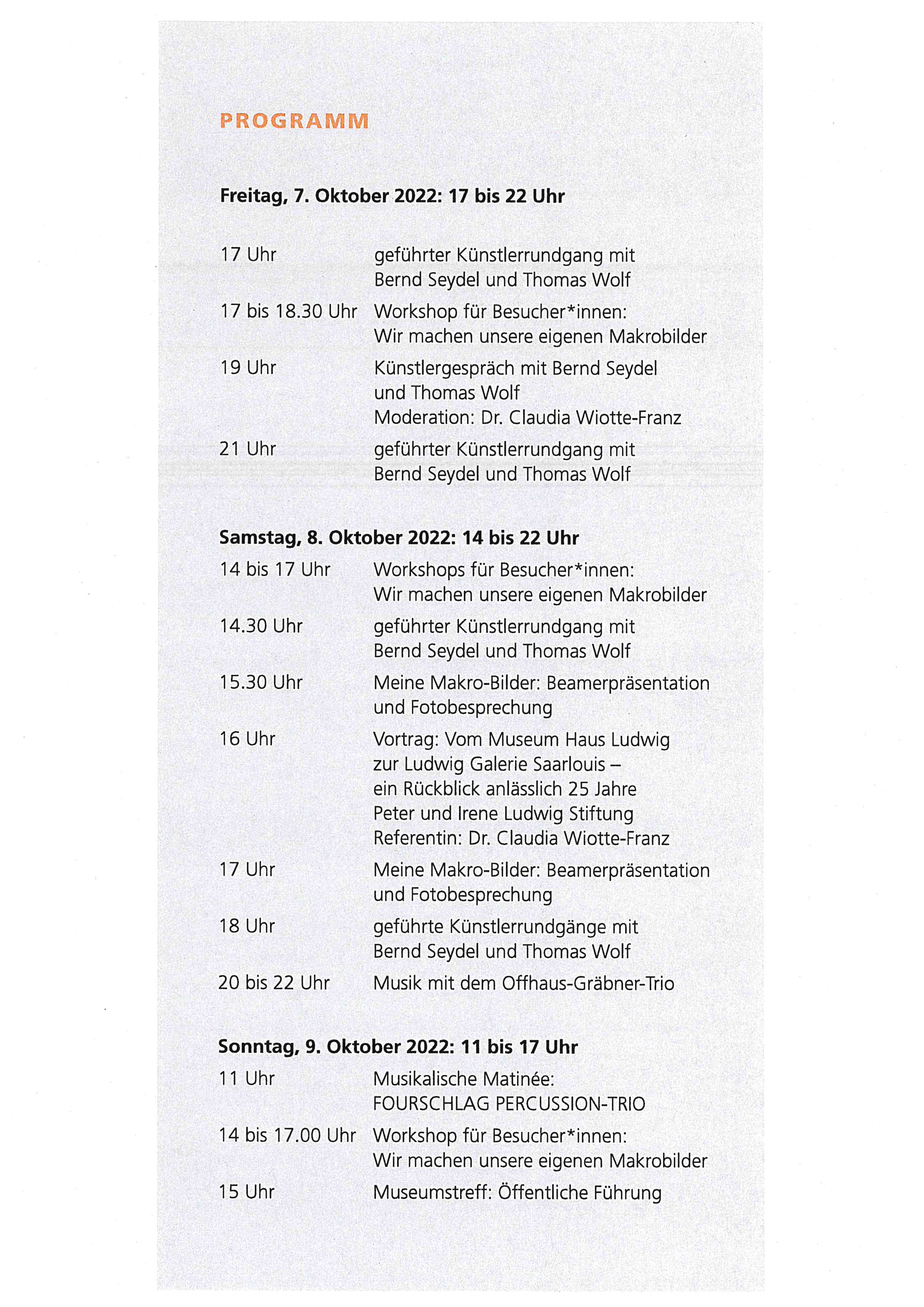 Los geht es am Freitag, 7. Oktober um 17 Uhr mit einem Künstlerrundgang der beiden Fotografen. Ebenfalls können die Besucher ab 17 Uhr in einem Workshop ihre eigenen Makrobilder herstellen, Fensterbilder gestalten oder aus und mit der Natur eigene Bilder fertigen. Am Workshop können Kinder, Jugendliche, Erwachsene, Familien und Senioren teilnehmen. Um 19 Uhr stehen Bernd Seydel und Thomas Wolf dann im Rahmen eines Künstlergesprächs für Fragen zum Thema Fotografie und Makrotechnik bereit. Das Künstlergespräch moderiert Dr. Claudia Wiotte-Franz, Leiterin der Ludwig Galerie Saarlouis.