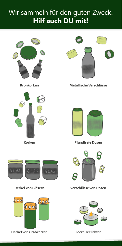 Gesammelt werden Kronkorken, metallische Verschlüsse, Deckel von Gläsern und Grabkerzen, leere Teelichter und pfandfreie Dosen, für den guten Zweck. So hat man sich nicht nur für eine soziale Aktion engagiert, sondern auch gleich den Umwelt- und Nachhaltigkeitsgedanken dabei berücksichtigt.
