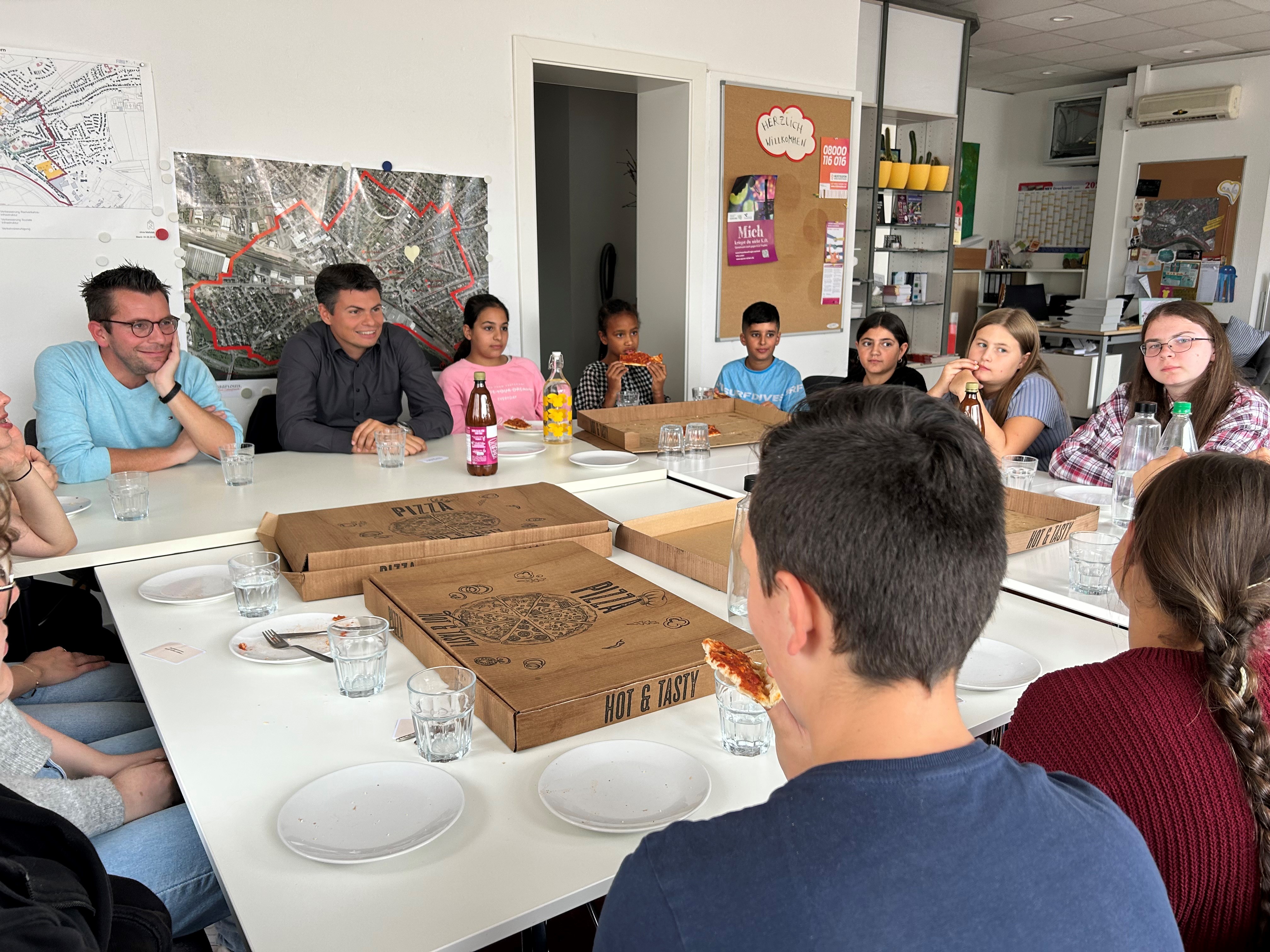 In gemütlicher Runde bei einem Stück Pizza war die anfängliche Scheu schnell überwunden und die Kinder und Jugendlichen löcherten die beiden Landtagsabgeordneten Florian Schäfer und Marc Speicher mit ihren Fragen. Rund 25 Fragen hatten die 15 Schüler*innen im Alter von 7 bis 15 Jahren vorbereitet und auf bunten Karten notiert. Nach zwei Stunden war die Fragestunde beendet - der Wissensdurst der jüngeren Generation aber noch lange nicht gestillt.