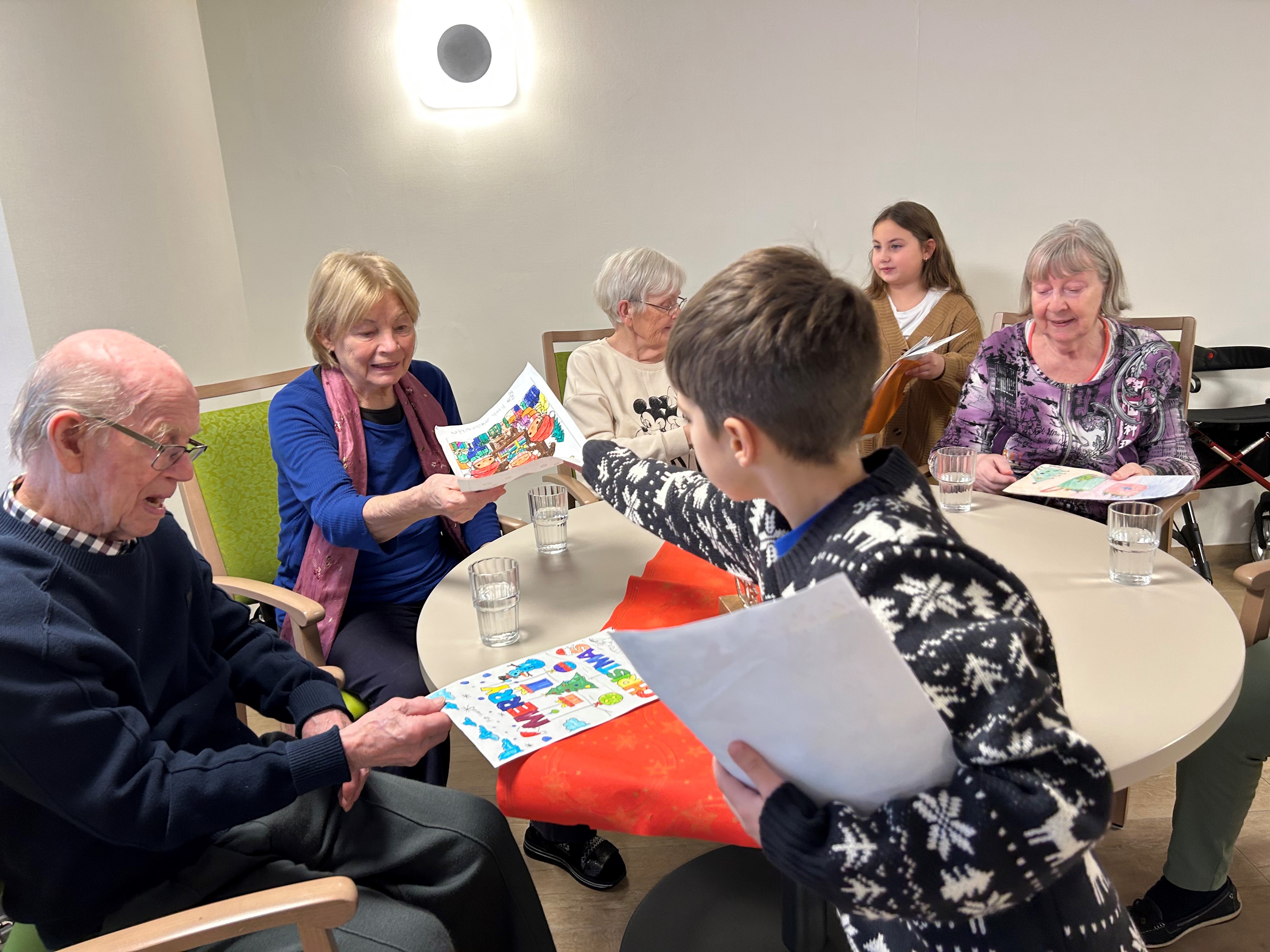Um die festliche Stimmung in der gesamten Einrichtung zu verbreiten, hatten sich die Schülerinnen und Schüler noch etwas ganz Besonderes einfallen lassen - selbstgemalte Bilder mit weihnachtlichen Motiven. Die kleinen Kunstwerke hatten die Kinder in den Tagen zuvor mit viel Hingabe gemalt und überreichten sie persönlich an die Bewohnerinnen und Bewohner. Die Freude war dabei auf beiden Seiten zu spüren. Die Schülerinnen und Schüler erlebten, wie wertvoll ihr Engagement für die älteren Menschen ist, und bekamen als kleines Dankeschön Schokonikoläuse überreicht. Die herzerwärmende Begegnung wird allen Beteiligten sicher noch lange in Erinnerung bleiben.