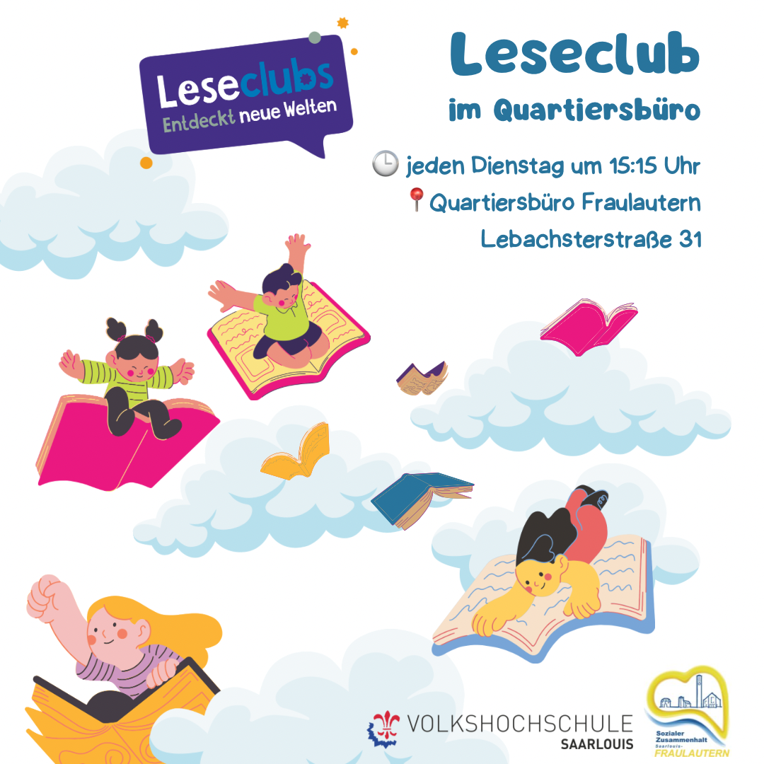 Das Quartiersbüro in Saarlouis Fraulautern bietet einmal wöchentlich einen Leseclub an. Jeden Dienstag von 15:15 bis 16:30 Uhr wird für Kinder im Alter von sechs bis zwölf Jahren eine unterhaltsame Umgebung gestaltet, um Fantasie zu entfalten, die Magie des Lesens zu erleben und die Welt der Bücher zu entdecken. Das Quartiersmanagement Fraulautern, die Volkshochschule Saarlouis und die Stadtbibliothek Saarlouis bieten gemeinsam ein vielfältiges Freizeitprogramm rund ums Lesen an. Im Leseclub gibt es noch freie Plätze für junge Leseratten. Aber auch Lesebegeisterte, die als Lesepatinnen und Lesepaten aktiv am Leseclub teilnehmen wollen, sind herzlich eingeladen.
