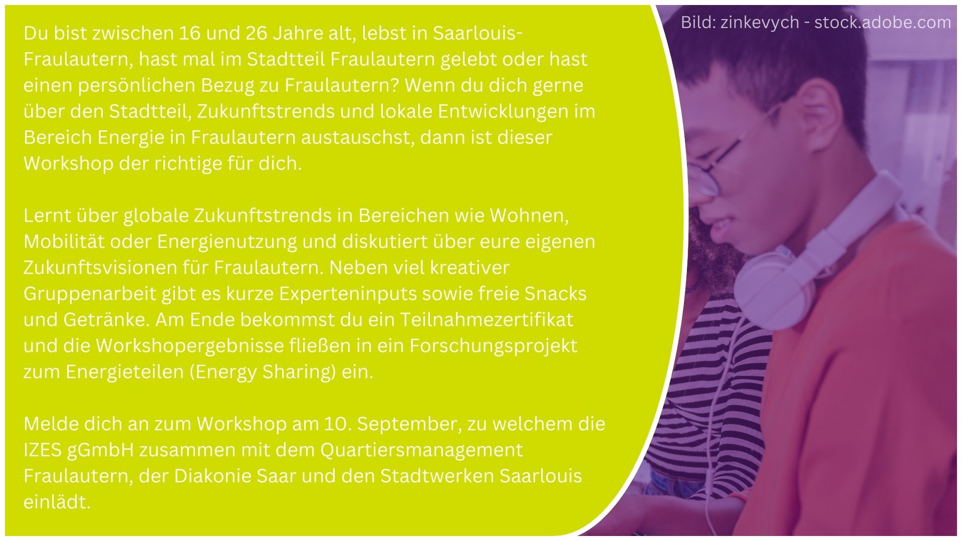 Die IZES gGmbH lädt ein zu einem Workshop für Fraulauterner zwischen 16 und 26 Jahren am 10. September 2024 im Haus Europa. Im Workshop können sich Jugendliche und junge Erwachsene über den Stadtteil austauschen, über Zukunftstrends und lokale Entwicklungen im Bereich Energie lernen und diskutieren und das leckere Buffet genießen. Für alle Teilnehmenden gibt es ein Teilnahmezertifikat. Der Workshop findet in Kooperation mit dem Quartiersmanagement Fraulautern, der Diakonie Saar und den Stadtwerken Saarlouis statt. Weitere Infos und Anmeldung unter: https://ee-gemeinschaften.de/workshop-in-fraulautern/.