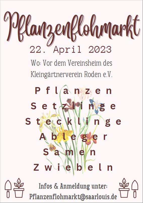 Kostenfreie Anmeldung bis zum 10. April 2023 per Mail: pflanzenflohmarkt@saarlouis.de oder telefonisch: 0173/6807528.
