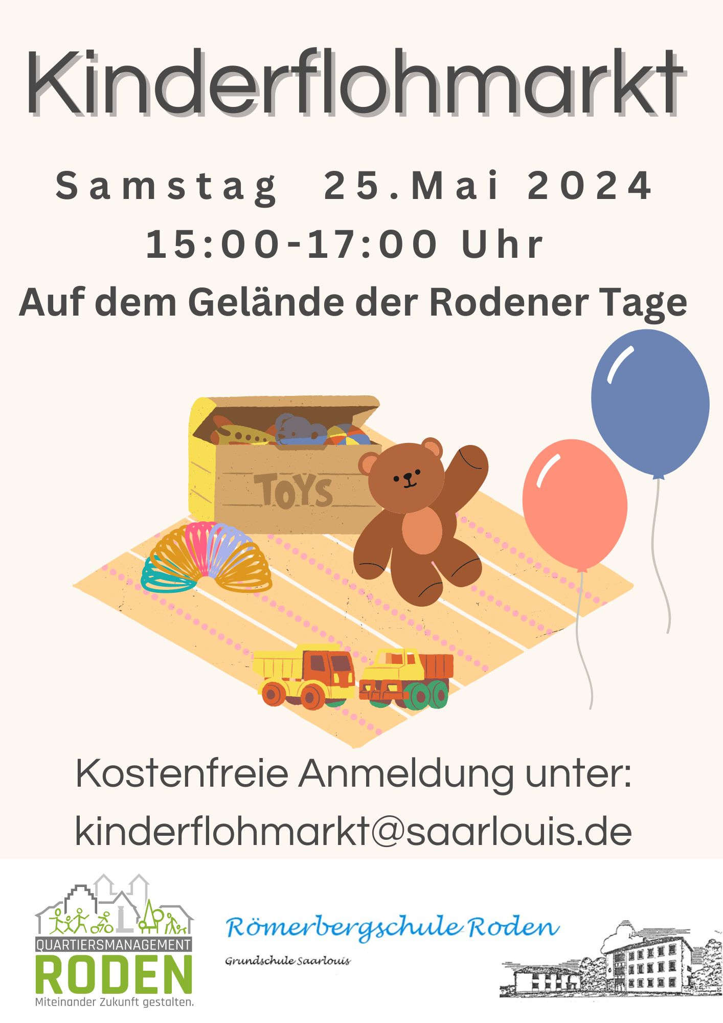 Anmeldung bitte unter kinderflohmarkt@saarlouis.de, per Post in den Briefkasten der Grundschule Römerberg oder telefonisch unter 06831/ 98698115.