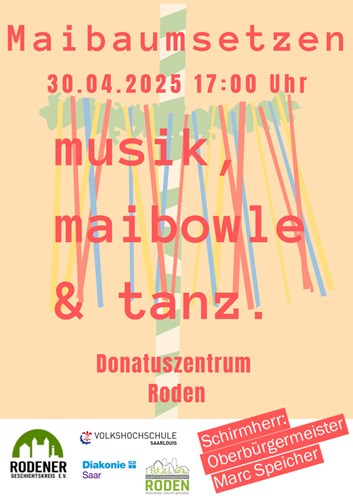 Unter Schirmherrschaft von Oberbürgermeister Marc Speicher lädt der Rodener Geschichtskreis in Kooperation mit dem Café 'Herz &Hand' der Diakonie Saar, der vhs der Stadt Saarlouis und dem Quartiersmanagement Roden zum gemeinsamen Maibaumsetzen am Donatuszentrum ein.