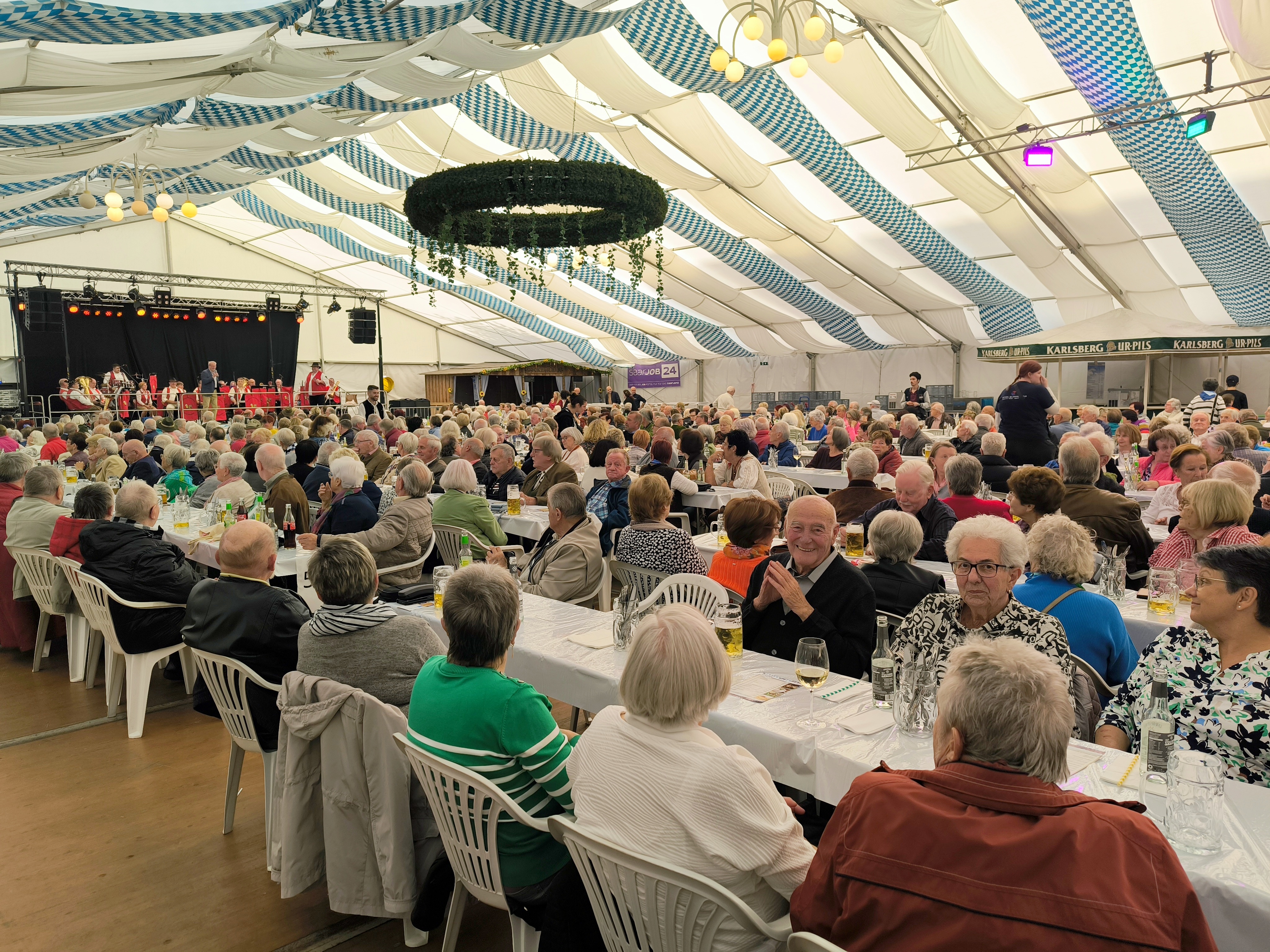 Die Kreisstadt Saarlouis hatte in Kooperation mit Reichelts Veranstaltungsservice auch in diesem Jahr wieder alle Mitbürgerinnen und Mitbürger über 70 Jahre eingeladen, gemeinsam zünftig zu feiern. Bei Maß-Bier, aber auch natürlich anti-alkoholischen Getränken, leckerem Hähnchengeschnetzelten mit Tagliatelle und Gemüse vom Grunder Gourmet Party- und Event-Catering genoss man gemeinsam das Programm, das Seniorenmoderatorin Birgit Cramaro und Abteilungsleiterin Sabine Schmitt nach der Begrüßung der Gäste durch Oberbürgermeister Marc Speicher und Bürgermeister Carsten Quirin auf die Bühne brachten. Mit dabei waren die Original Bubacher Dorfdudler, die Volksbühne Piesbach und die Faasend Rebellen vom Steinrausch, es moderierte Hans Werner Strauß.