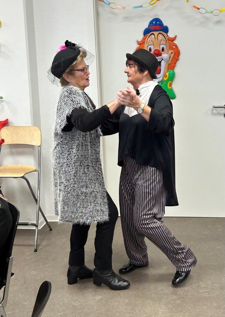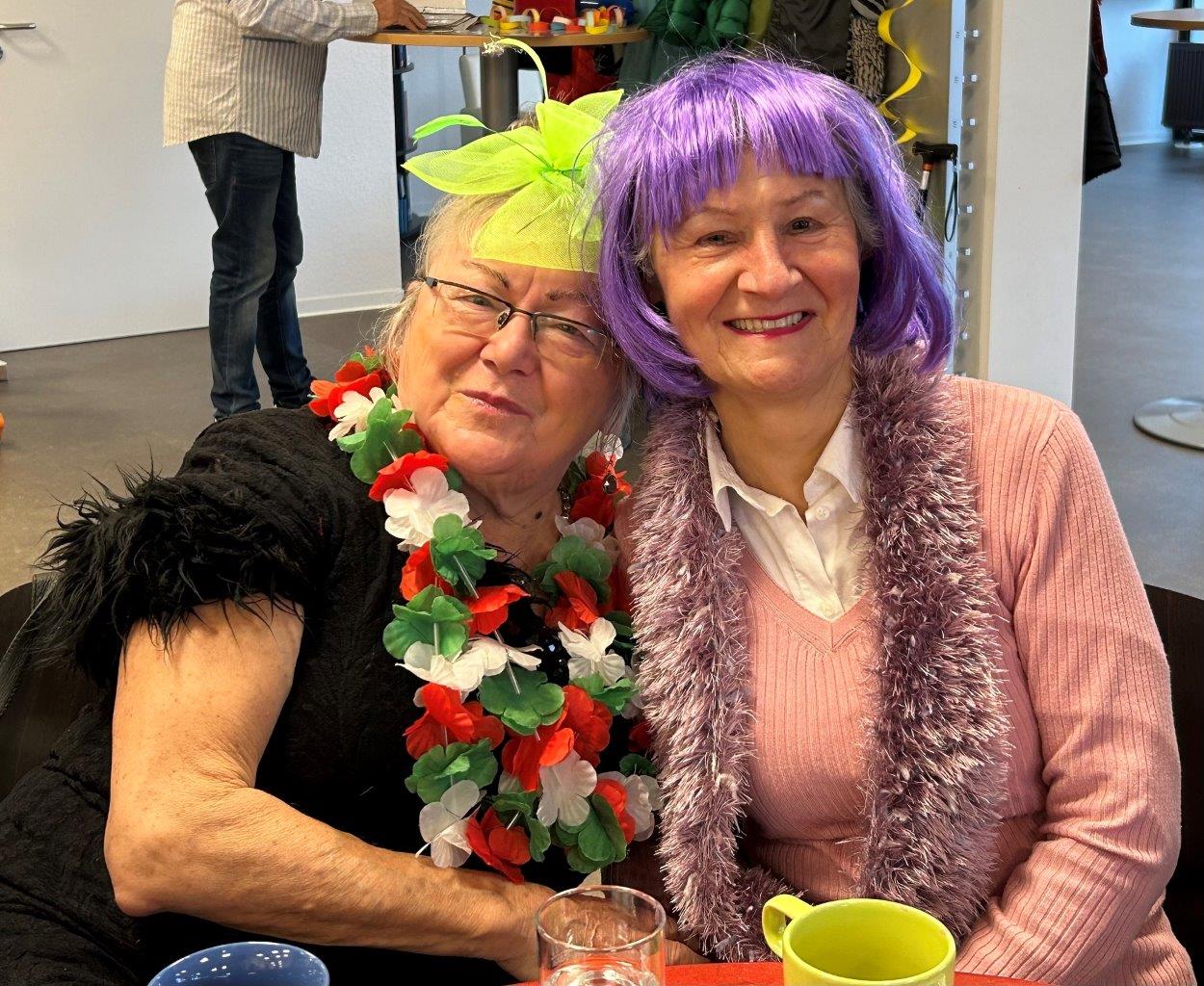 Birgit Cramaro und Brigitte Bilz (beide stehend) veranstalteten eine bunte Fastnachtsfeier im Esther-Bearano Haus. (Fotos: Sabine Schmitt)
