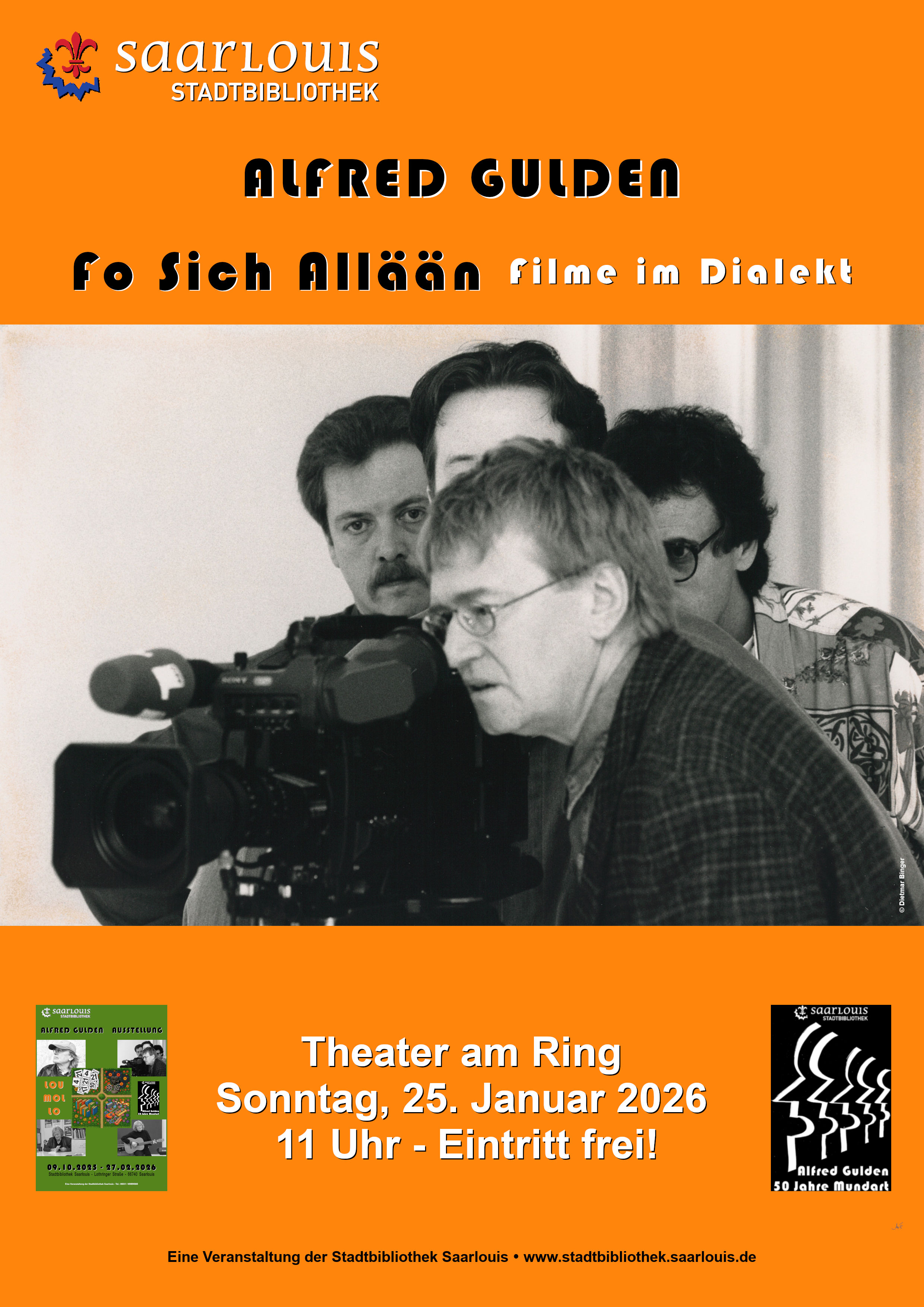 Die Stadtbibliothek Saarlouis lädt mit Alfred Gulden zur Filmmatinée und Lesung „FO SICH ALLÄÄN“ am Sonntag, 25. Januar 2026 um 11 Uhr in den Festsaal des Theater am Ring Saarlouis ein. Der Eintritt ist frei. (Aé)