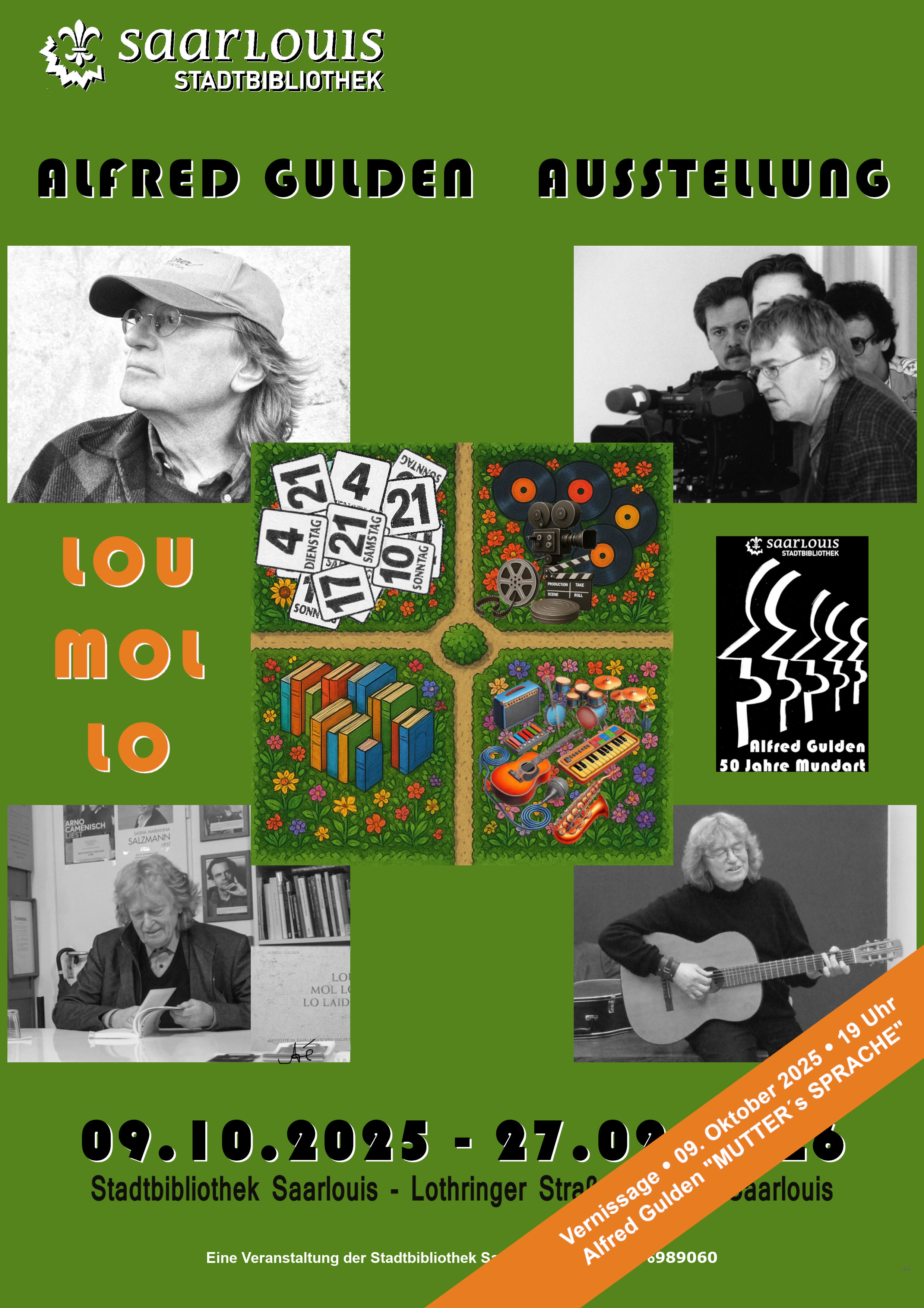 Als zweiten Teil der Reihe und als Rahmen für die bis Februar 2026 stattfindenden Veranstaltungen gibt es in der Stadtbibliothek Saarlouis ab 09.10.2025 eine Ausstellung zu den Mundartwerken von Alfred Gulden.