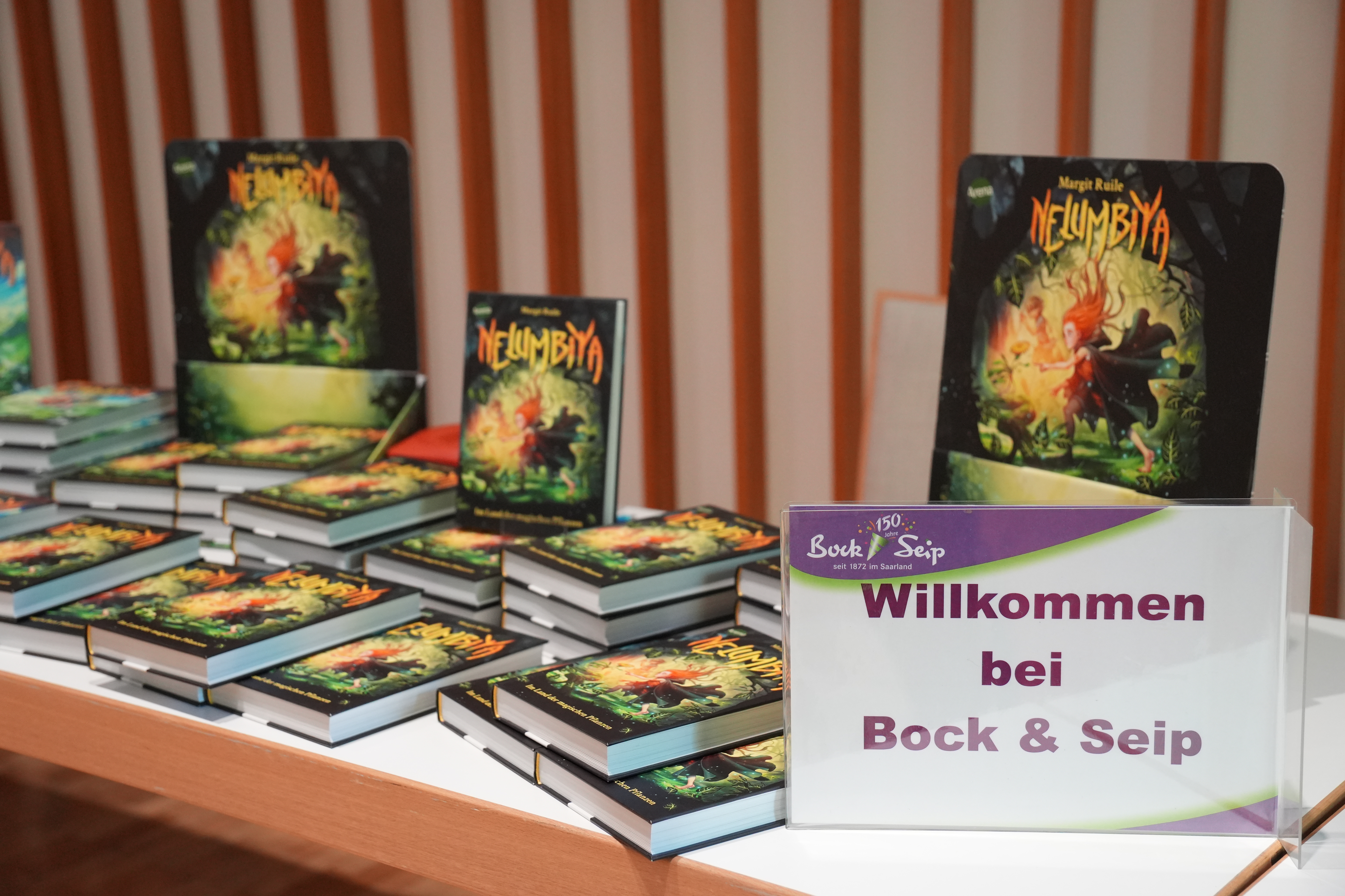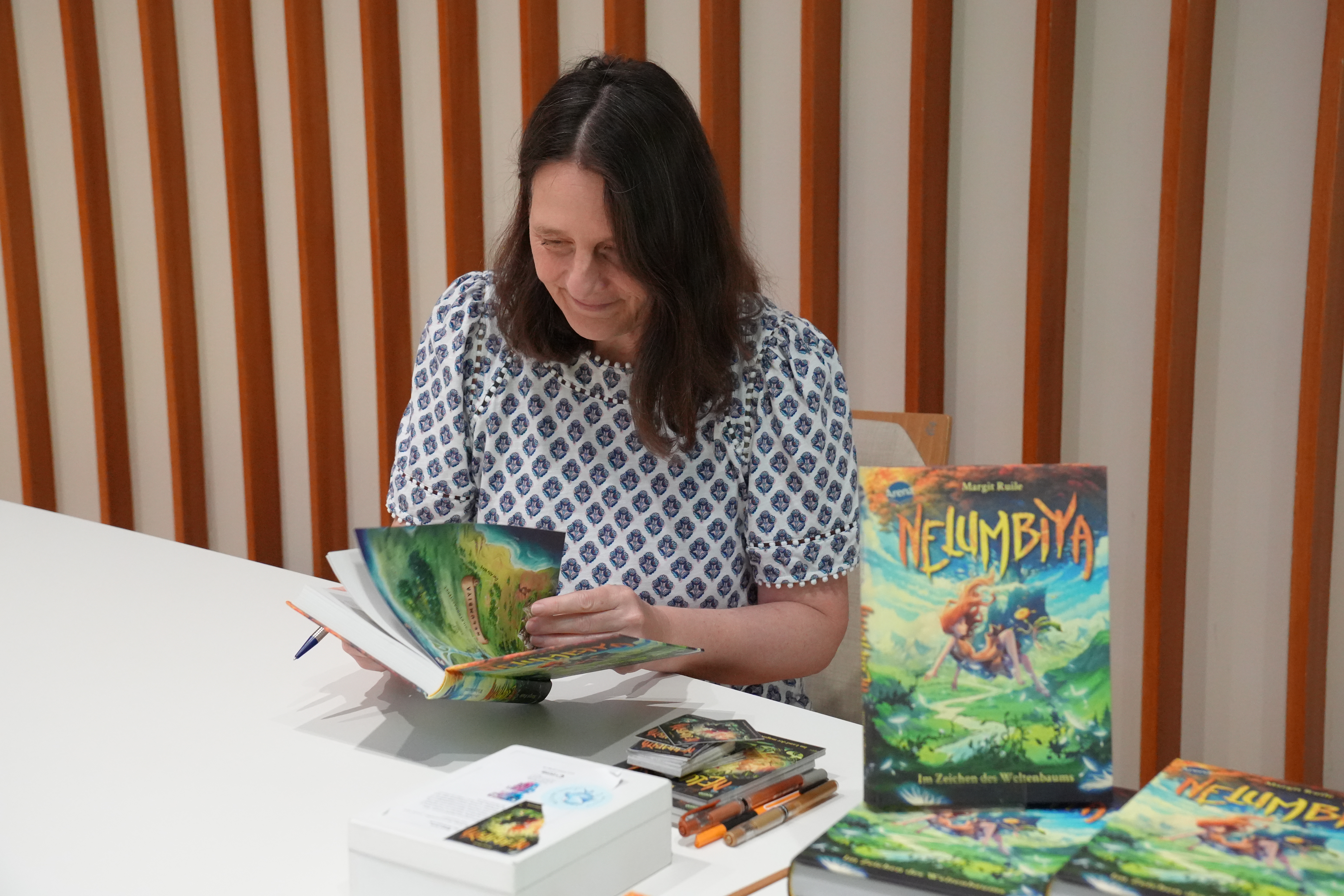 Die Kinder folgten der spannenden Lesung mit großer Aufmerksamkeit und hörten gebannt zu. Besonders begeistert waren sie, als sie selbst Teil der Geschichte werden durften: Sie imitierten flüsternde Bäume, deren Blätter im Wind rauschten, und verliehen der Geschichte so eine ganz eigene Klangkulisse. Margit Ruile gab zudem Einblicke in ihre Arbeit als Autorin und beantwortete im Anschluss an die Lesung zahlreiche neugierige Fragen – vom Schreibprozess über die Entstehung der Charaktere bis hin zu ihrer früheren Tätigkeit als Regisseurin und der Entwicklung der fantastischen Welt von Nelumbiya.