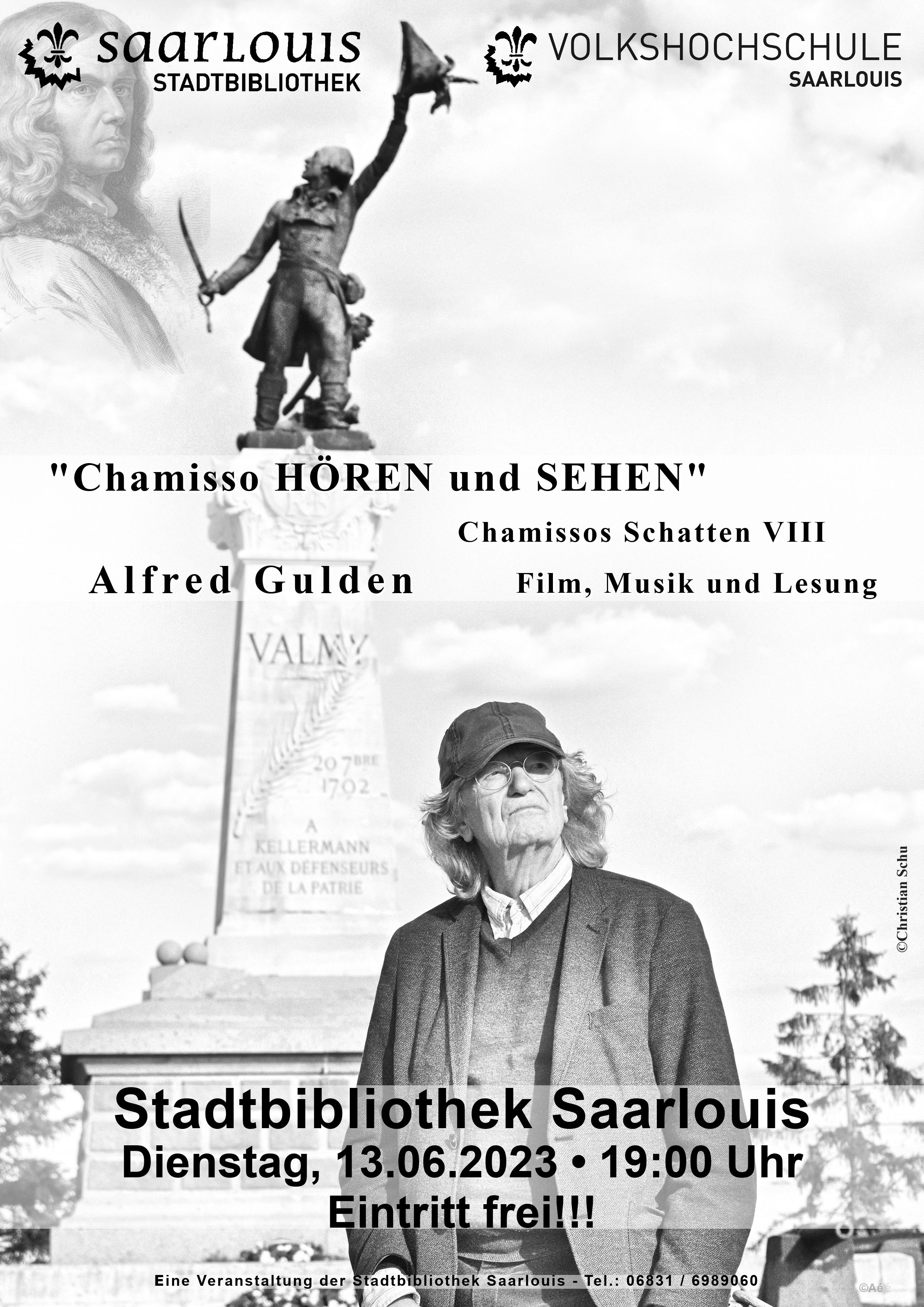 Als 2009 der erste Chamisso-Abend der Stadtbibliothek Saarlouis und der vhs Saarlouis mit Alfred Gulden stattfand, war nicht vorauszusehen, dass über die Jahre hin die Beschäftigung mit dem Dichter Adelbert von Chamisso diese Ausmaße annehmen würde. Der erste Vortrag unter dem Titel „CHAMISSOS SCHATTEN - Bücher im Leben des Dichters, Naturforschers und Weltbürgers Adelbert von Chamisso“ des Schriftstellers, Lyrikers, Lieder- und Filmemachers Alfred Gulden fand noch in den alten Räumen der Stadtbibliothek Saarlouis in der preußischen Kaserne VI statt. Sowohl die Stadtbibliothek wie die vhs Saarlouis sind jetzt schon mehrere Jahre im Theater am Ring untergebracht, aber die Reihe „CHAMISSOS SCHATTEN“ mit Alfred Gulden gibt es immer noch. In dieser Zeit gab es fast jährlich einen Chamisso-Abend, bei jedem Teil wurde ein neuer Aspekt über den deutsch-französischen Autor Louis Charles Adélaïde de Chamissot de Boncourt bekannt als Adelbert von Chamisso erkundet und von Alfred Gulden unterhaltsam und informativ vorgetragen.