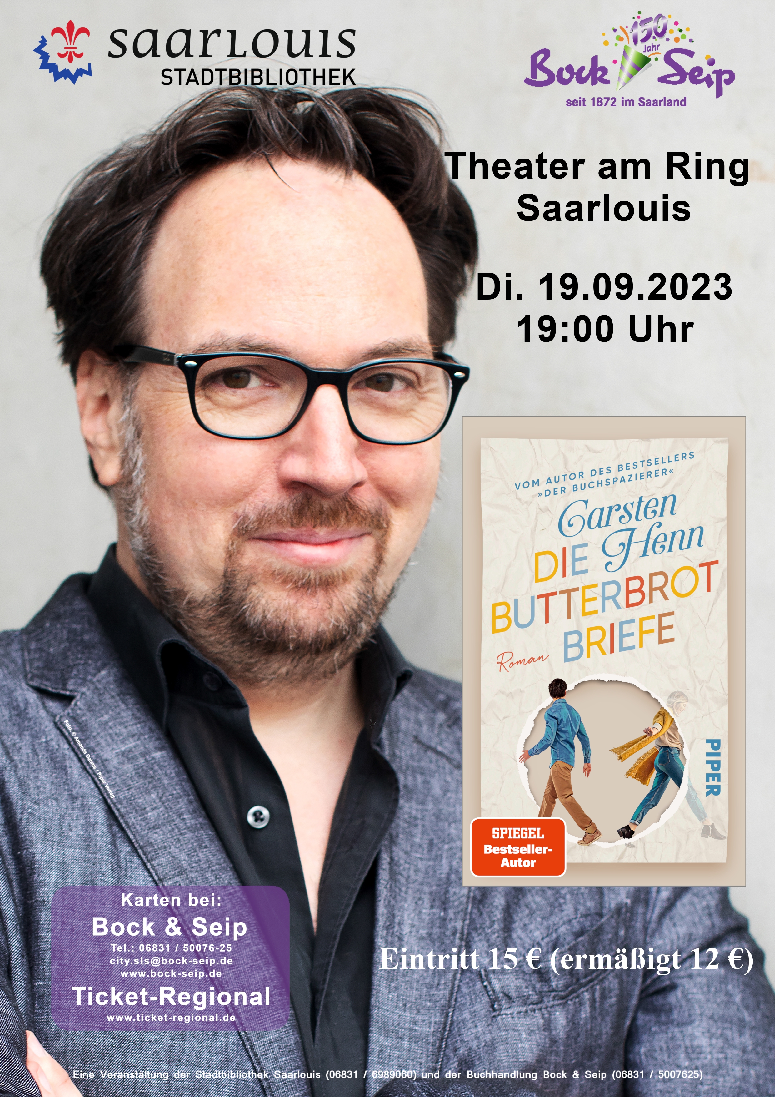 Die Stadtbibliothek Saarlouis und die Buchhandlung Bock & Seip laden zu einer der ersten Lesungen von Carsten Henn aus seinem neuesten Roman „Die Butterbrotbriefe“ am Dienstag, 19. September 2023 um 19 Uhr in das Theater am Ring, Kaiser-Friedrich Str. 26, 66740 Saarlouis ein.