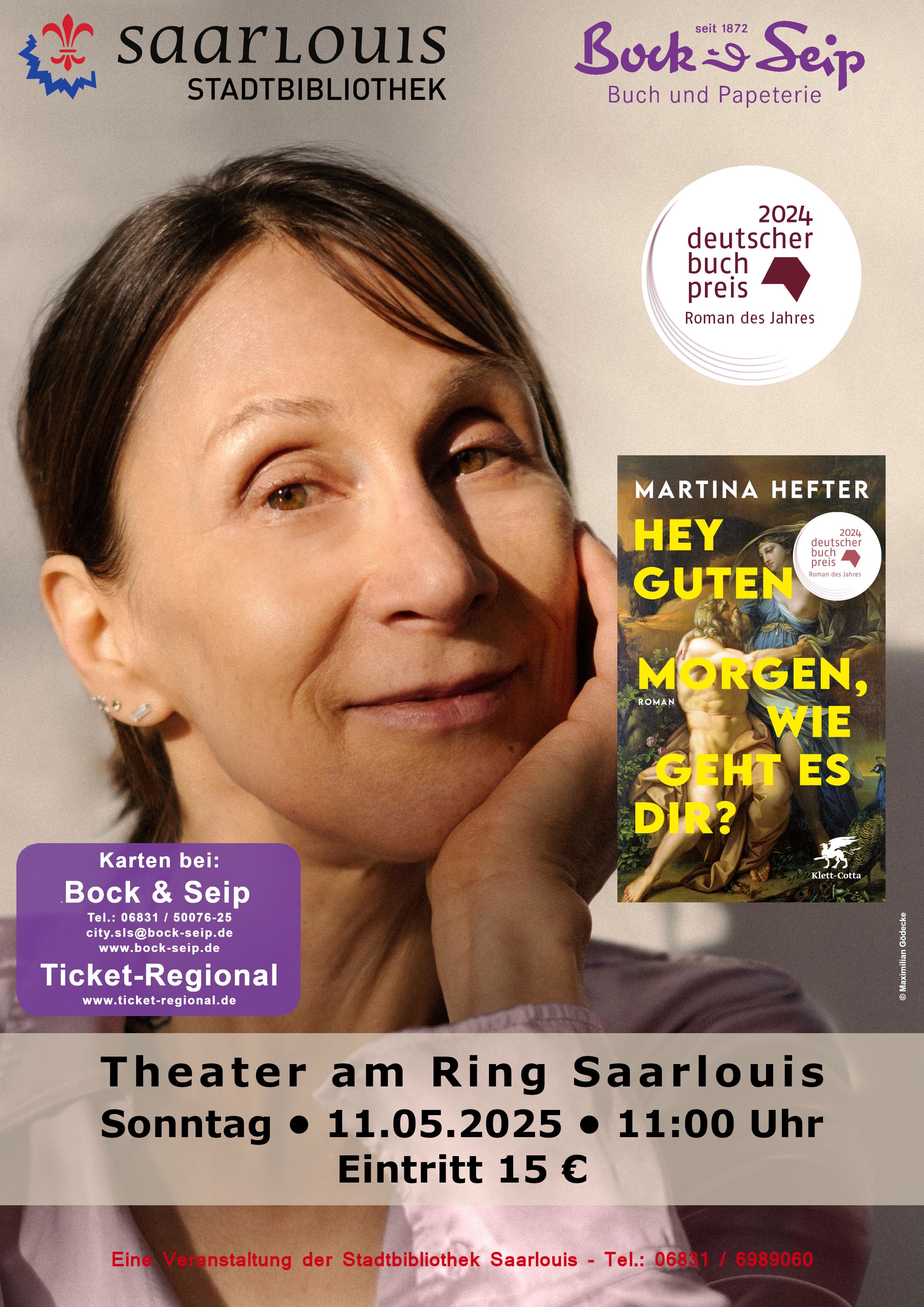 Am Sonntag, 11. Mai 2025 um 11 Uhr liest die aktuelle Trägerin des Deutschen Buchpreises Martina Hefter auf Einladung der Stadtbibliothek Saarlouis und der Buchhandlung Bock & Seip aus ihrem Roman „Hey guten Morgen, wie geht es Dir?".