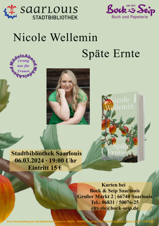 Dieses Jahr gibt es wieder eine Buchpremiere. Nicole Wellemin liest aus ihrem Roman „Späte Ernte, der dieser Tage frisch in den Buchhandel kommt.