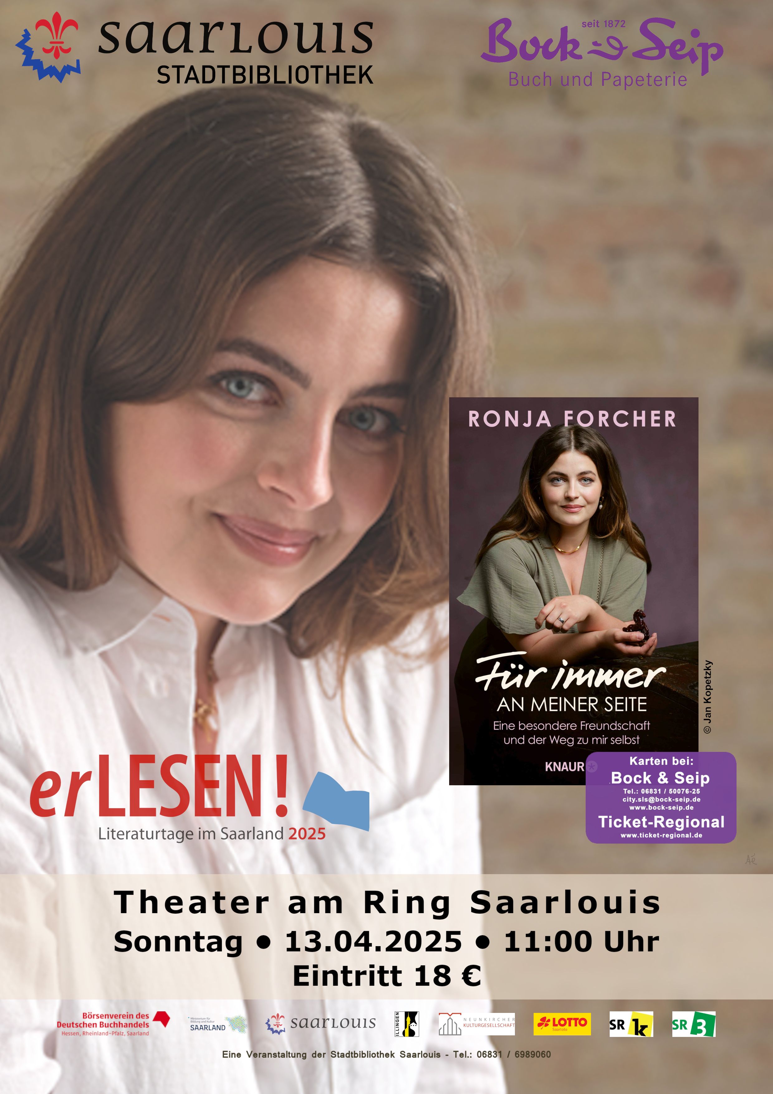 Die Buchhandlung Bock & Seip und die Stadtbibliothek Saarlouis präsentieren im Rahmen des Literaturfestivals erLESEN! am Sonntag, 13. April 2025 um 11 Uhr die Schauspielerin und Sängerin Ronja Forcher mit ihrem berührenden, biographischen Buch "Für immer an meiner Seite".