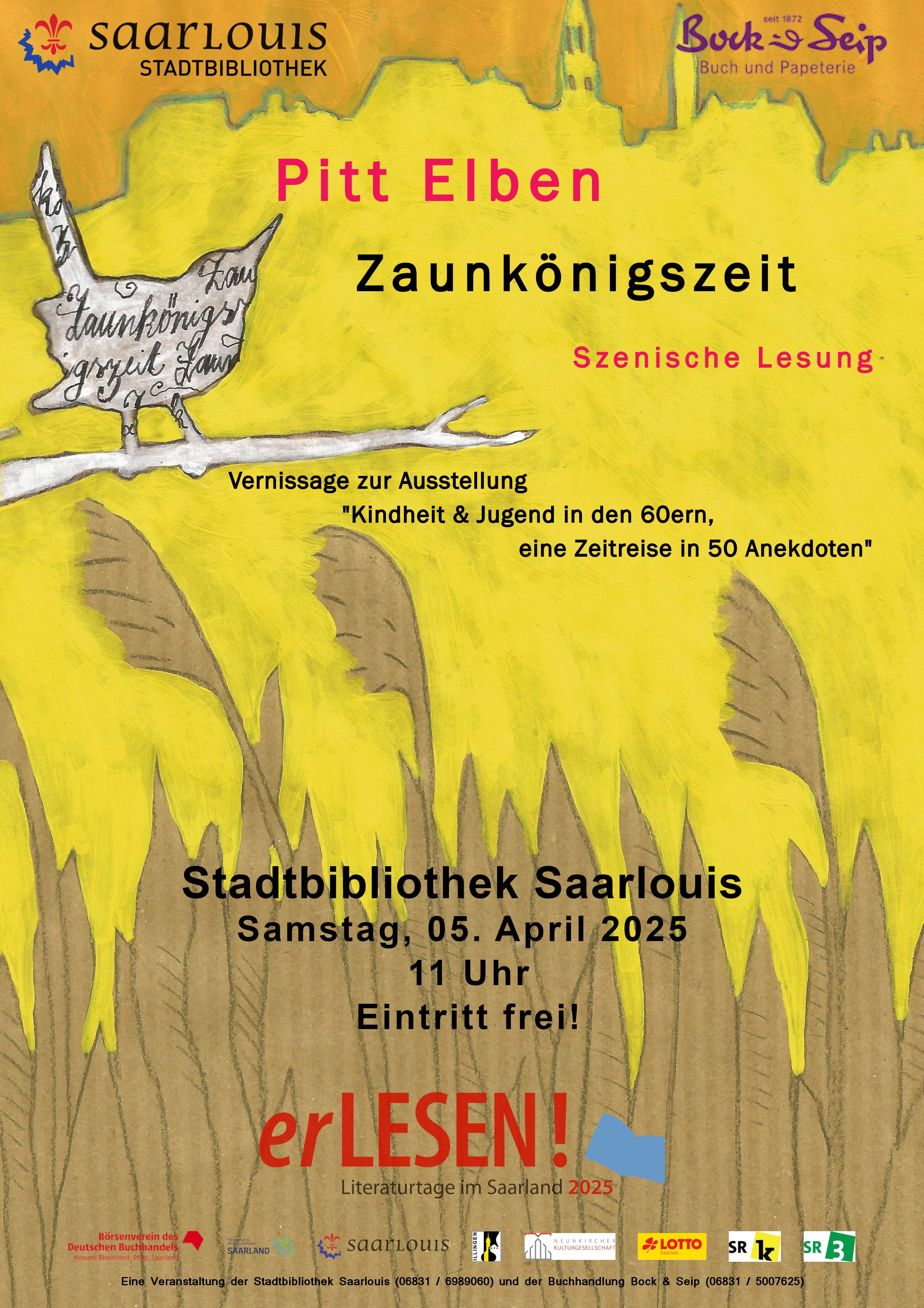Pitt Elben wird aus seinem Roman „Zaunkönigszeit“ am Samstag 5. April 2025 um 11 Uhr in den Räumen der Stadtbibliothek Saarlouis im Theater am Ring lesen. Zur Lesung im Rahmen des Literaturfestivals erLESEN! laden die Buchhandlung Bock & Seip und die Stadtbibliothek Saarlouis bei freiem Eintritt ein.