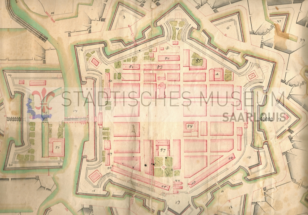 Gärten innerhalb der Festungswälle von Saarlouis. „Plan de Sarrelouis“, um 1725.