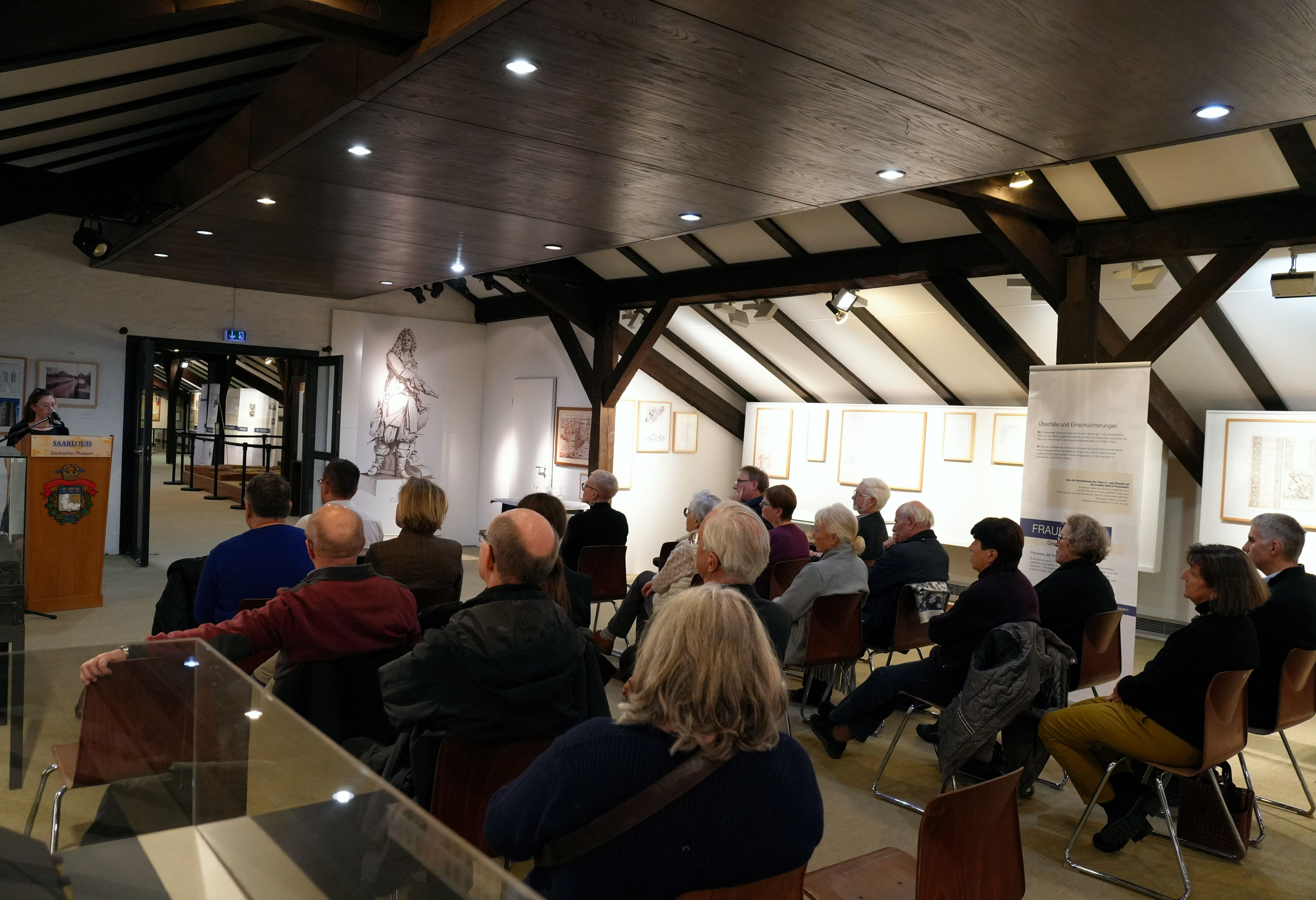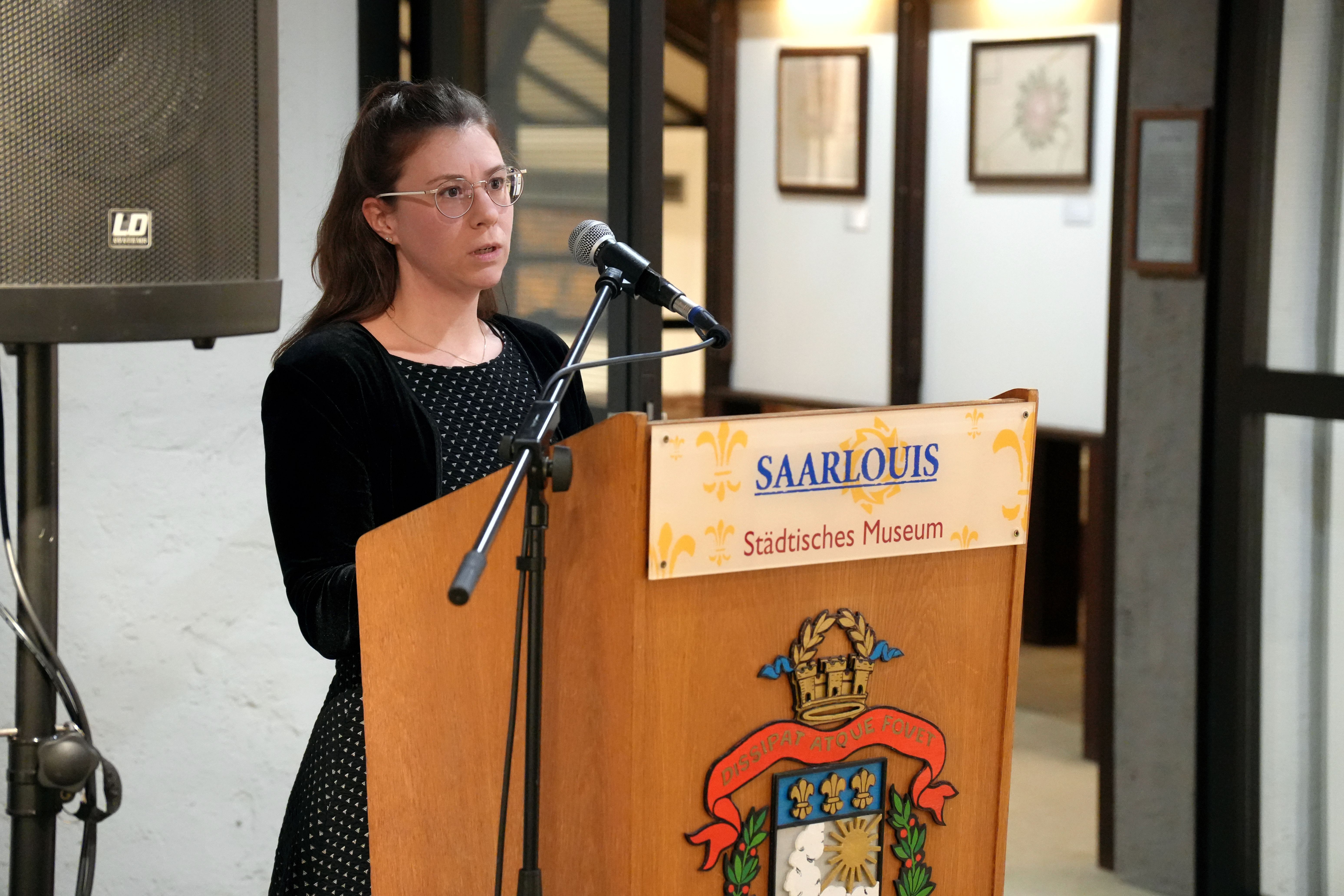Celina Grasse vom Adolf-Bender-Zentrum führte anschließend in die Ausstellung ein. Sie beleuchtete die furchtbaren Ereignisse und ihre Auswirkungen, schilderte aber auch das davor herrschende blühende jüdische Leben im Landkreis Saarlouis.