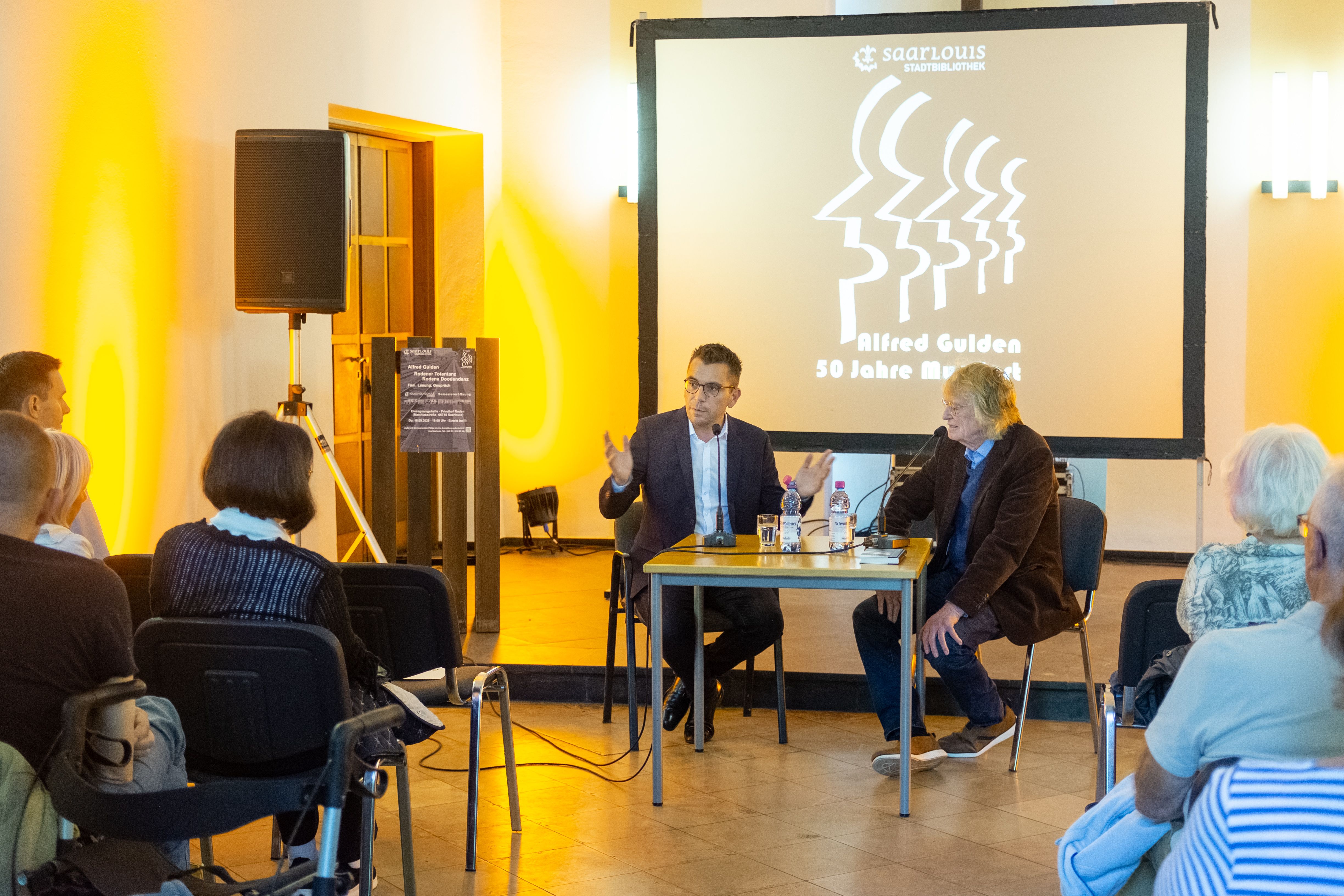 Ein Stück Rodener Erinnerungskultur stand im Mittelpunkt einer besonderen Lesung der Stadtbibliothek Saarlouis und der vhs Saarlouis mit dem Schriftsteller, Filmemacher und Dichter Alfred Gulden. Oberbürgermeister Marc Speicher betonte bei der Begrüßung, wie wichtig kulturelle Angebote in Saarlouis und den Stadtteilen für die Identität und den Zusammenhalt vor Ort sind. Mit persönlichen Eindrücken und lebendigen Schilderungen knüpften Gulden und Speicher ein Band zwischen Vergangenheit und Gegenwart ihres Heimatortes Roden. Im Gespräch in der Halle auf dem Rodener Friedhof als einem Ort des Lebens und der Begegnung sprach Gulden über das heutige Roden und erinnerte zugleich an die Nachkriegsjahre und den wirtschaftlichen Aufschwung. Mit seinen Gedichten in „Rodena Platt“, der Sprache seiner Mutter, baute er eine poetische Brücke über die Jahrzehnte und verfolgte gleichzeitig das zentrale Anliegen seiner künstlerischen Arbeit: die Aufwertung und kreative Nutzung der Mundart, die in den 1970er-Jahren noch als „Sprache der einfachen Leute“ galt.