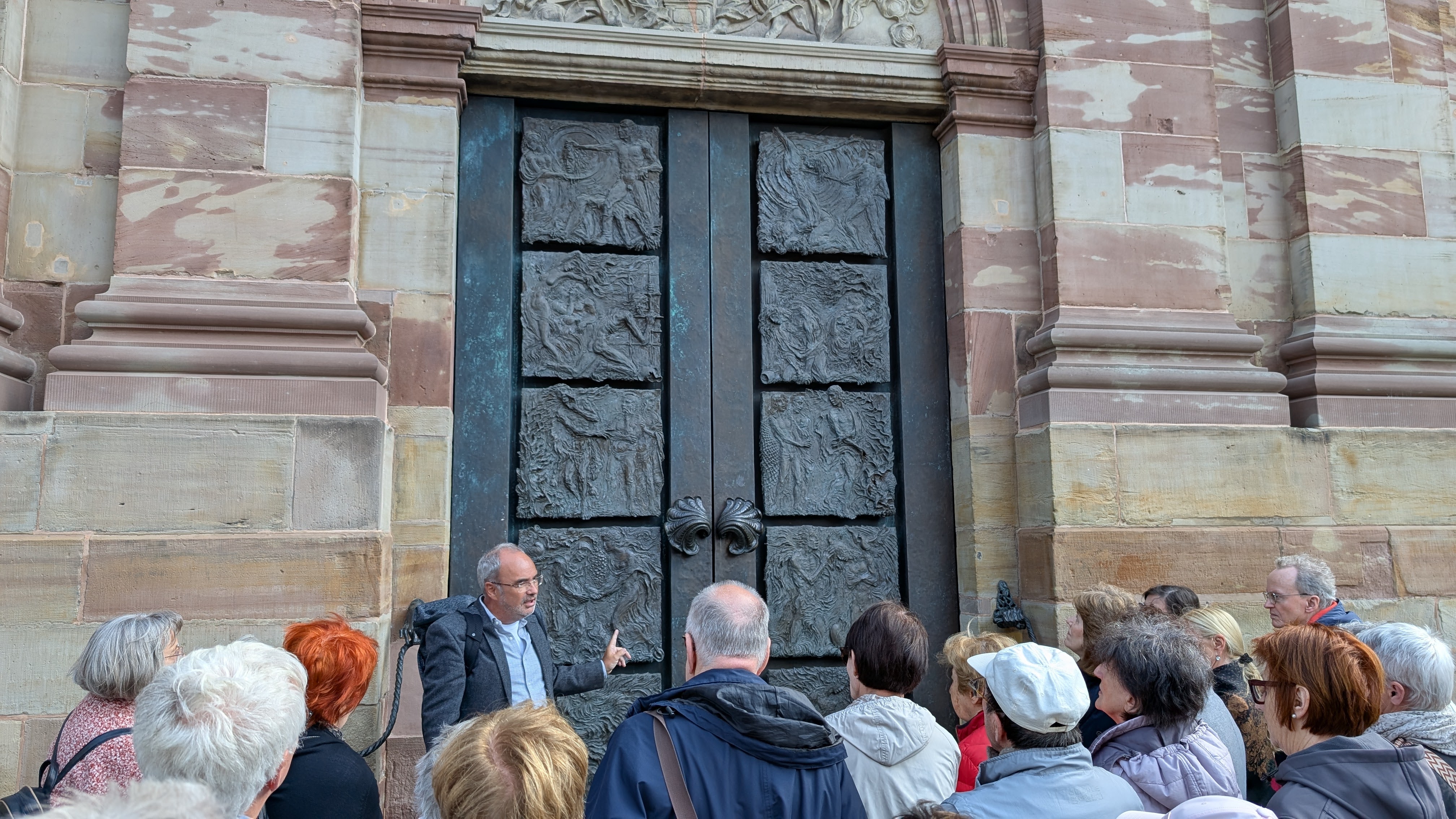 Am Portal der Basilika St. Johann erläuterte Heribert Denzer die symbolreiche Gestaltung der Türflügel, die in Ernst Alts unverkennbarem Stil biblische Themen mit dramatischer Ausdruckskraft verbindet. An der Gestaltung des Portals arbeitete er 12 Jahre lang (1974-1986) und entwarf hierfür im Vorfeld Hunderte von Zeichnungen. Nicht nur die Außen-, sondern auch die Innenseite des Portals mit Januskopf als Türgriff ist bemerkenswert (Inschrift: „Bonus intra – Melior exi“, „Als Guter gehe ein – als Besserer hinaus“).