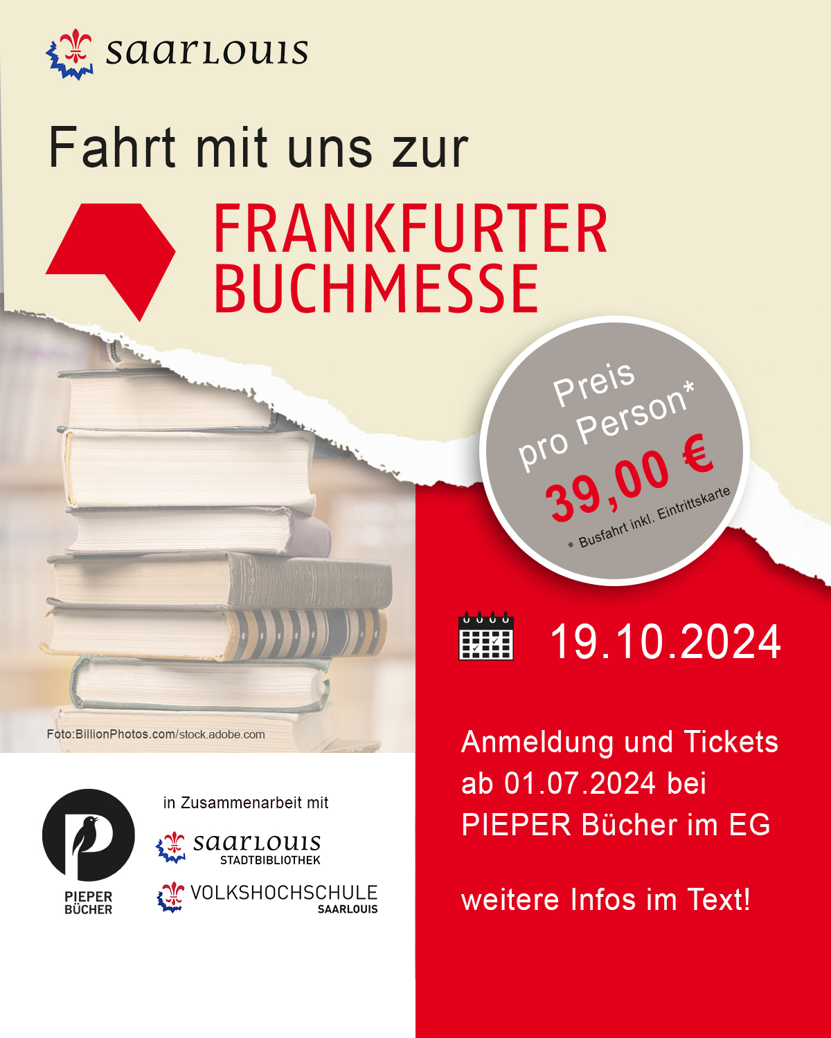 Eine Tagesfahrt von Saarlouis zur Frankfurter Buchmesse findet am Samstag, 19. Oktober als Kooperation von Stadtbibliothek, vhs Saarlouis und Pieper Bücher statt.