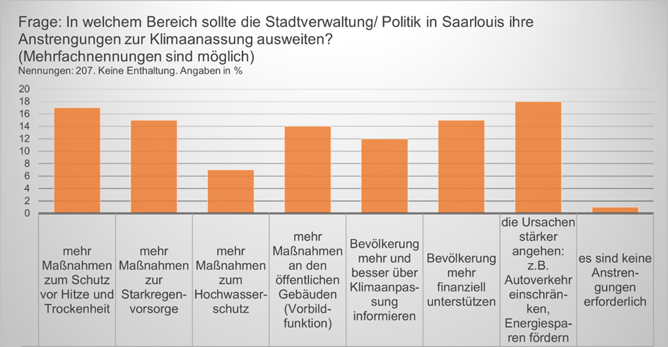 Besonderen Handlungsbedarf seitens der Politik und Stadtverwaltung sehen die Befragten bei der Ursachenbekämpfung, sprich der Umsetzung und Förderung von Klimaschutzmaßnahmen (18%, von 207 Nennungen, Mehrfachnennungen waren möglich), sowie Maßnahmen zum Schutz vor Hitze und Trockenheit (17%).