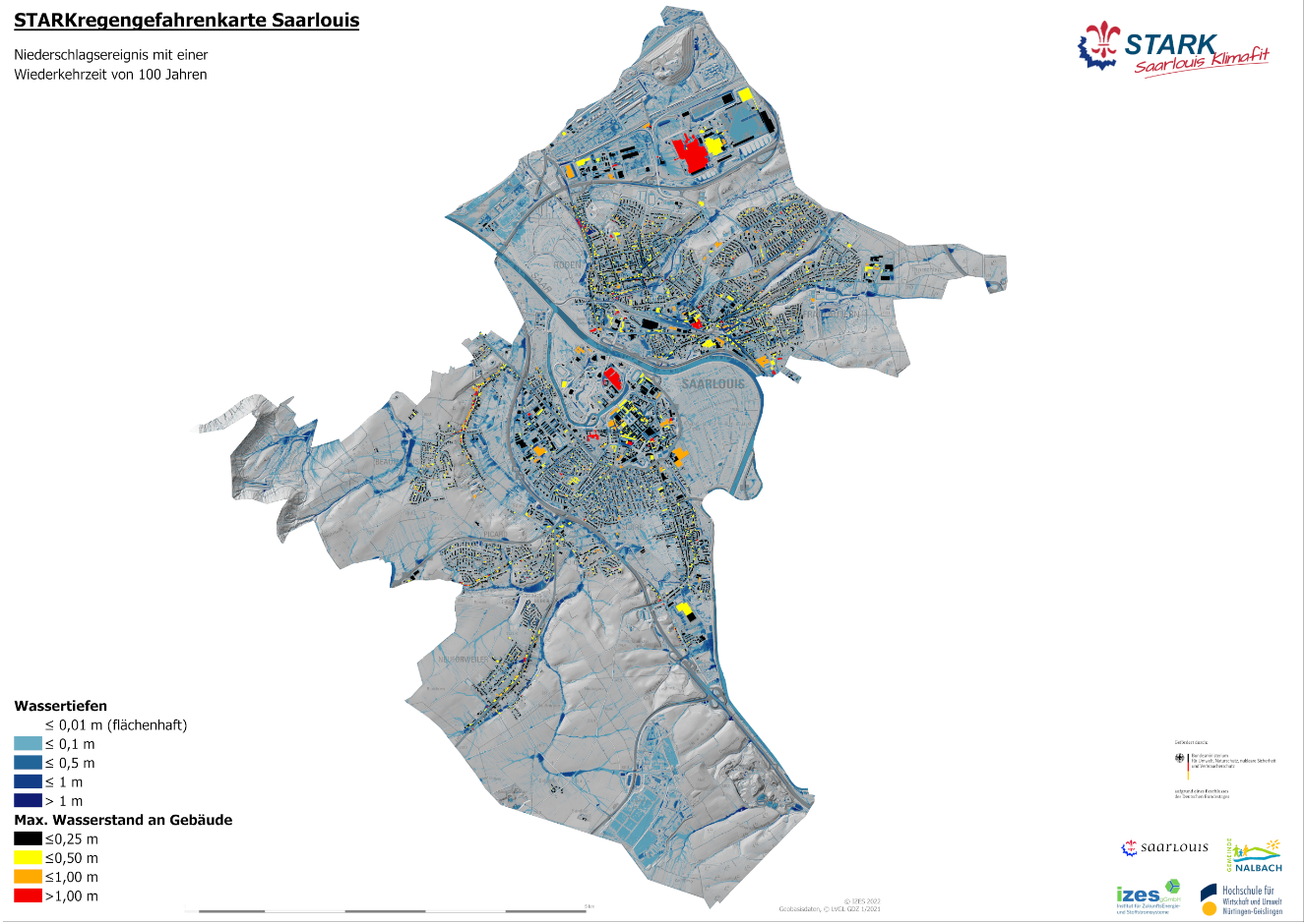 In Folge des Klimawandels erwartet die Stadt Saarlouis eine Zunahme von Hitze- und Starkregenereignissen. Um sich vor solchen Extremwetterereignissen besser schützen zu können, wurden für das gesamte Saarlouiser Stadtgebiet im BMUV geförderten Projekt STARK (2021-2023) Hitzekarten und Starkregenkarten durch die IZES gGmbH und die HfWU Nürtingen-Geislingen erstellt.