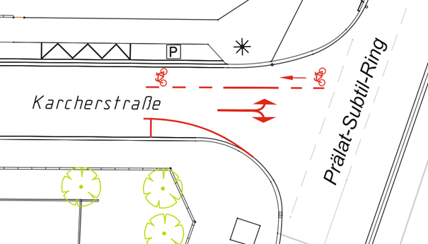 Die Karcherstraße im Abschnitt zwischen Prälat-Subtil-Ring und Augustinerstraße wurde für den Radverkehr ertüchtigt. Dieser Streckenabschnitt ist als Einbahnstraße mit der Fahrtrichtung von der Augustinerstraße in Richtung Prälat-Subtil-Ring geregelt. Damit Radfahrer auch vom Prälat-Subtil-Ring Richtung Augustinerstraße, also in die entgegengesetzte Richtung, fahren dürfen und können, wurde die Verkehrsregelung derart geändert, dass die Strecke in der Gegeneinbahnrichtung freigegeben wurde. Zur Unterstützung dieser Regelung und zur Verbesserung der Verkehrssicherheit wurden Piktogramme auf der Fahrbahn aufgebracht und an der Einmündung zum Prälat-Subtil-Ring wurde eine Radpforte markiert (siehe folgende Lageskizze).